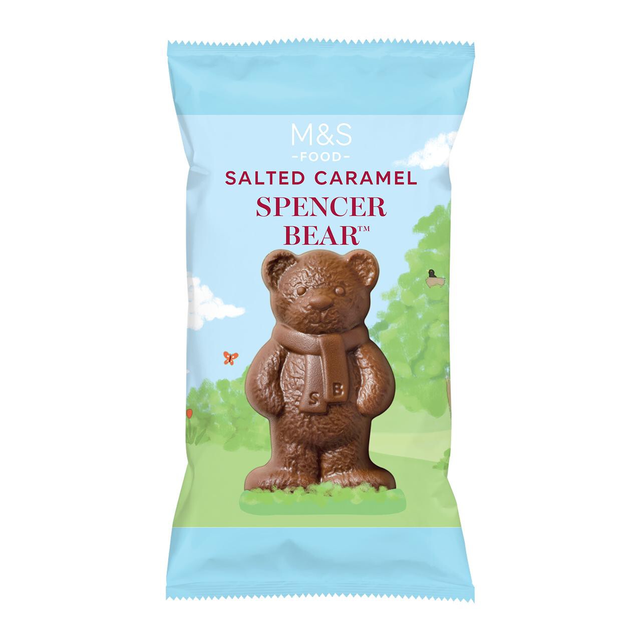 This delightful M&S Food confection features the charming, branded Spencer Bear™. It is crafted entirely from smooth milk chocolate and contains a rich, salted caramel centre for a satisfying texture. The playful design and character branding make this a wonderful seasonal treat for personal indulgence or gifting.