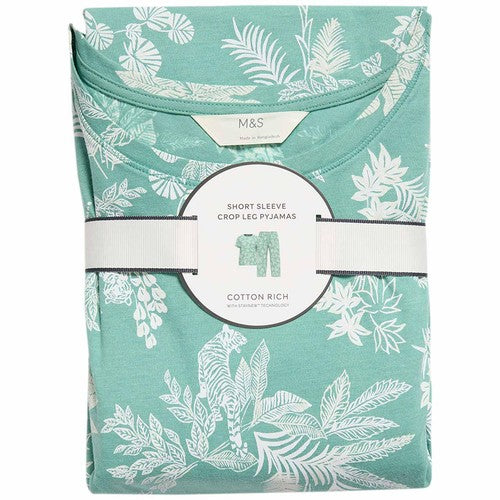 Discover these playful, cotton-rich pyjamas featuring a distinctive all-over Floral Tiger print. Designed for comfort, this regular fit set includes short sleeves and modern cropped legs. The material blend ensures a pleasant feel for relaxing moments.