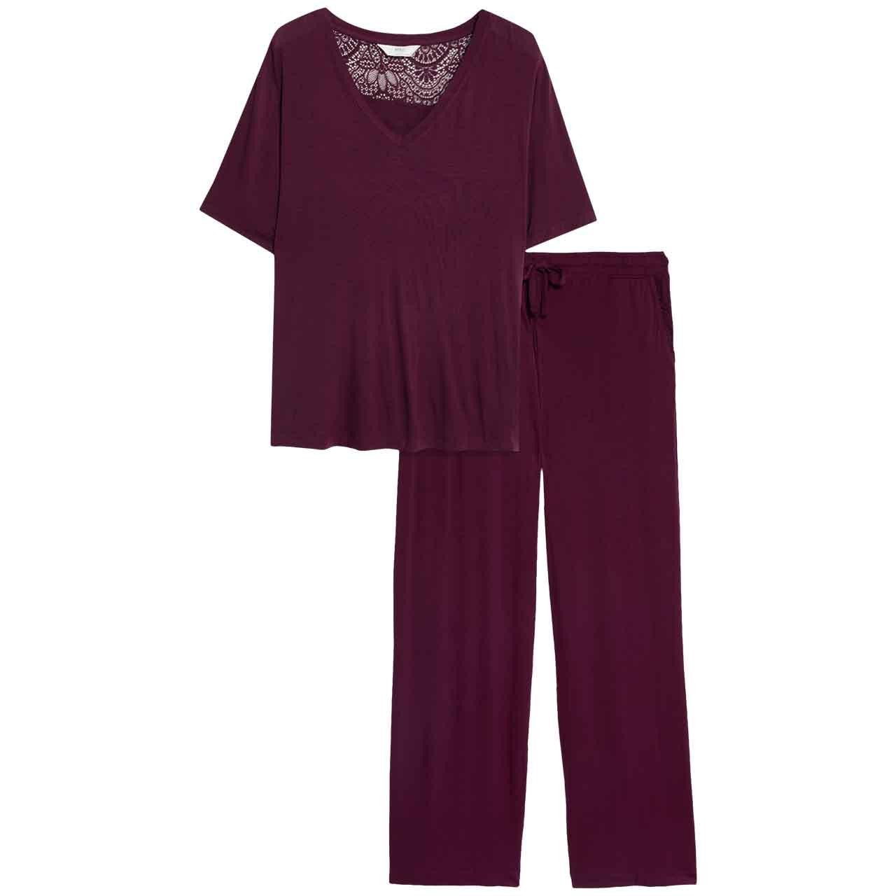 Relax in comfort with this M&S two-piece pyjama set in a rich dark magenta hue. This sleepwear is crafted from soft, flowing viscose fabric for a gentle feel against the skin, ensuring restful nights. The top features elegant lace detailing at the back neckline for a refined touch.