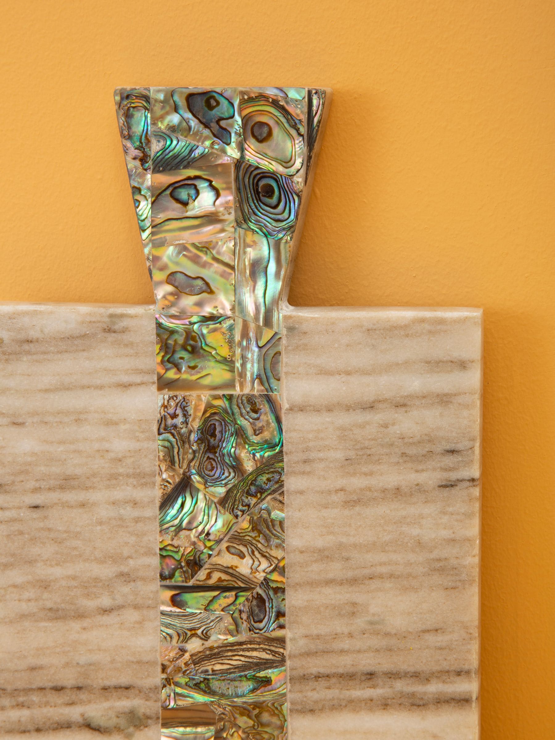 This small paddle board is carved from beige marble which features a straight veining pattern in light and dark hues. It has an exquisite Paua shell stripe across the middle of its muted toned surface and handle which gives them a texture. The iridescent tones lend this multifunctional board a minimal gleaming touch.