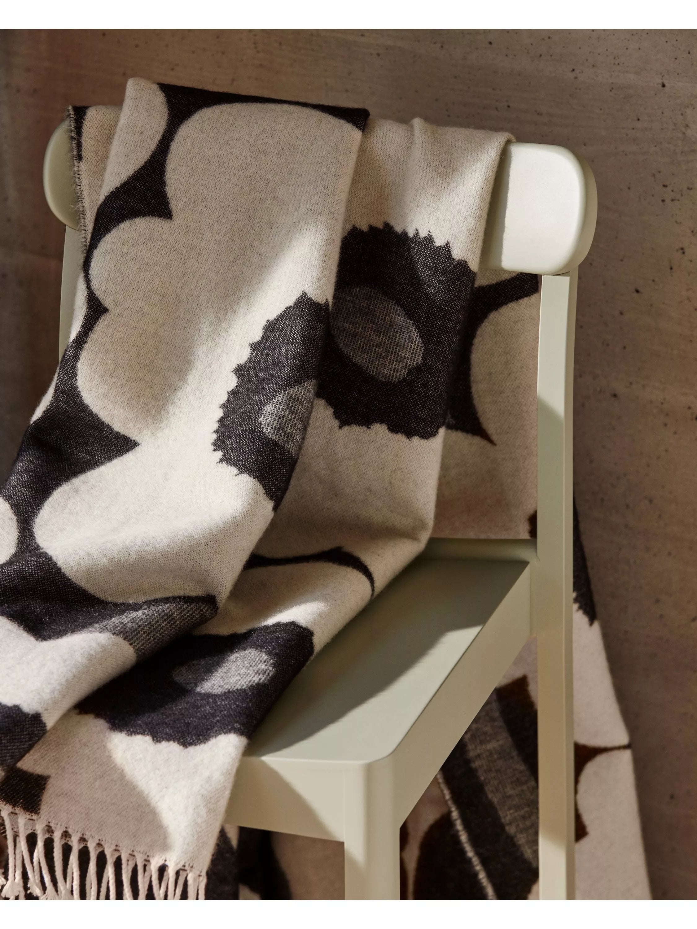 This beautiful wool and cotton blend throw, with fringes at the ends, is sure to keep you warm. Decorated with the classic black and white Unikko pattern, the throw is reversible, with the back side being a clever colour negative of the front.