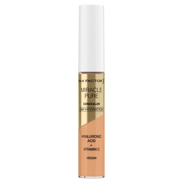 Read Morebelieve in miracles inspired by skincare mastered by max factor new miracle pure concealer is clinically proven to care for skin while you wear it the lightweight formula contains hyaluronic acid vitamin c and peptides it gives medium natural coverage and works perfectly on the face and under the eyes providing creaseless all day gentle coverage illuminating brightening and giving 24hydration clinically and dermatologically tested suitable for sensitive skin with a super soft flexible and precise applicator available in 8 shades and designed to work in harmony with max factors miracle pure foundation