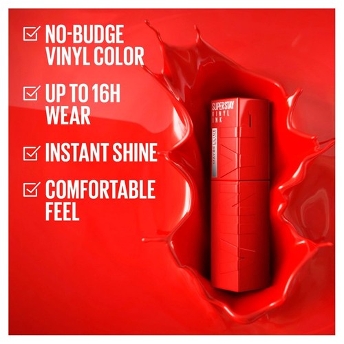 Meet the SuperStay Vinyl Ink liquid lipstick that delivers no-budge vinyl colour for up to 16 hours. This long lasting liquid lipstick features a unique Color Lock formula that actively resists smudging and transfer throughout the day. It instantly sets to a high-shine finish, offering durable wear without sacrificing comfort.