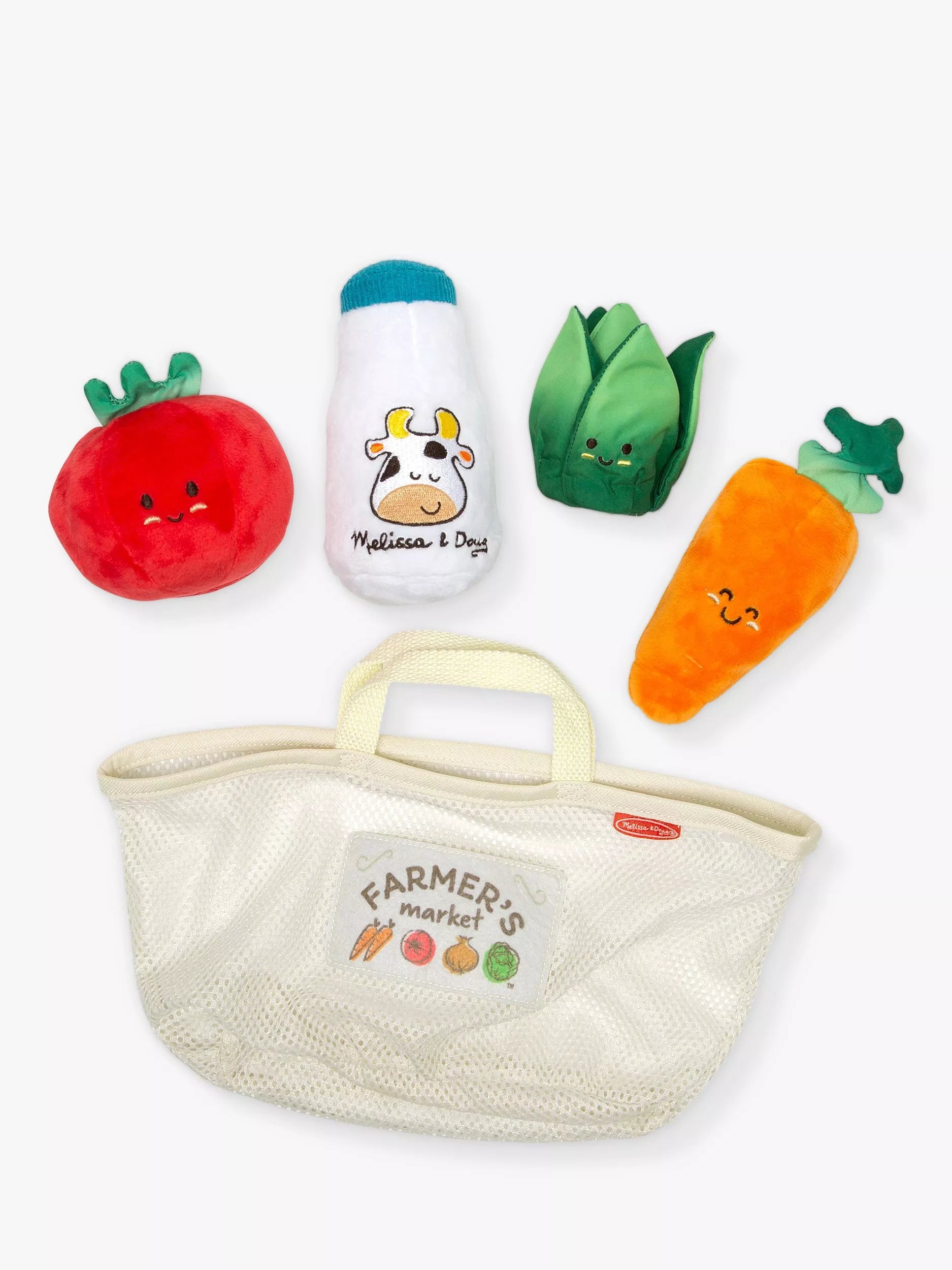 Practise role-playing with these cute soft toys from Melissa & Doug. The set includes a soft farmer's market bag complete with soft grocery items including a tomato, a carrot, a bottle of milk, and a head of lettuce.