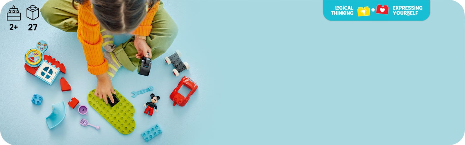 This buildable sorting toy for toddlers helps preschoolers learn through creative play. They can take turns with their grown-up spinning the wheel and then use their matching skills to pair the images with the colored accessories. This buildable vehicle playset includes tasks such as tuning up the buildable toy car with the wrench or cleaning it with the bucket and brush. Little fingers practice fine motor skills as they explore engaging features, such as the hinged window, the buildable slide toy and the spinning car wheels. This LEGO® DUPLO® role-play construction toy for kids inspires toddlers to use imagination and self-expression to invent their own creative Mickey Mouse Clubhouse adventures.