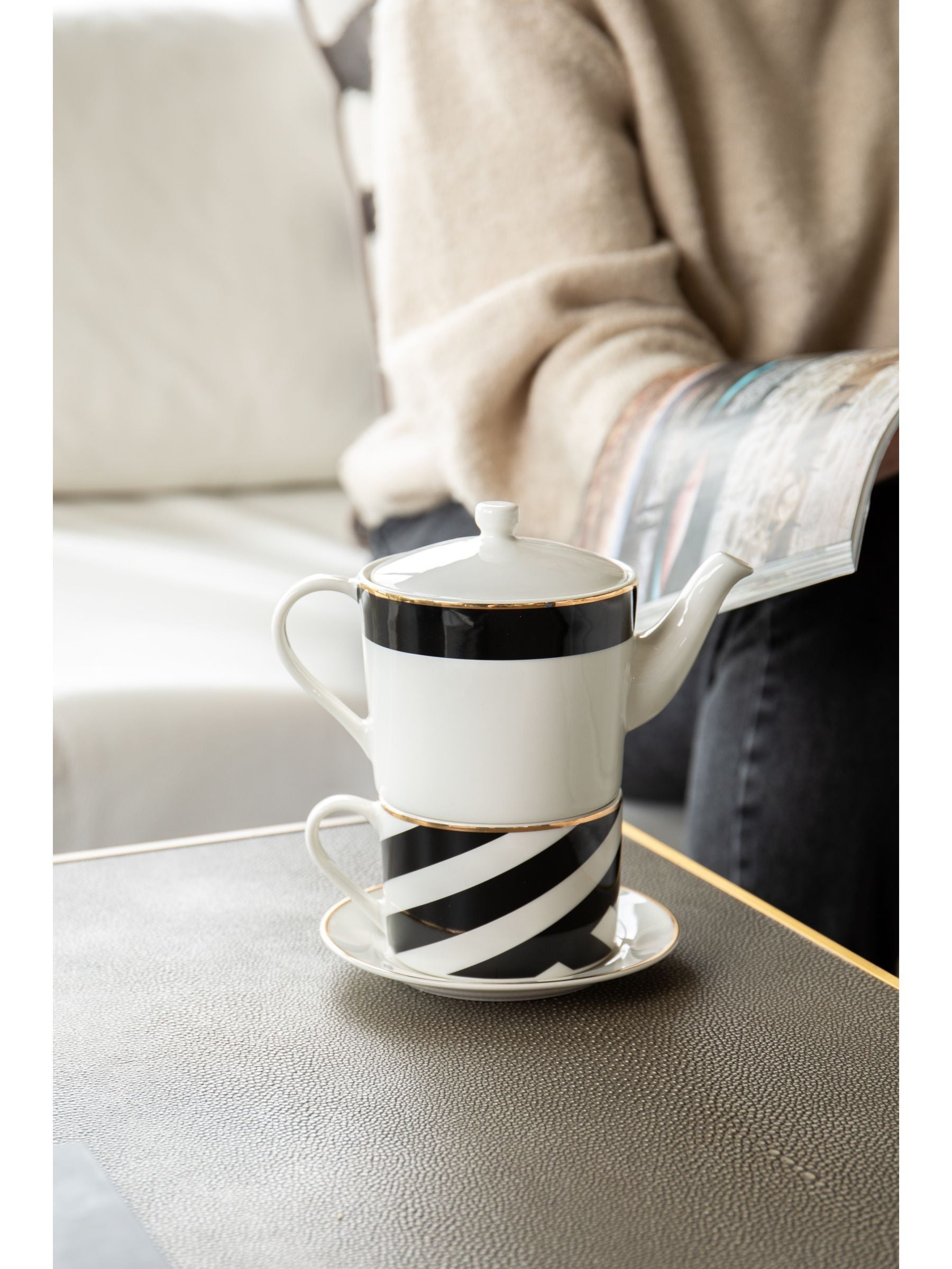 . Includes a teapot, tea cup and saucer, which all stack to form a neat display piece . Just right for one person, so you can treat yourself to a proper cup of tea whenever you like . Thick bands and real gold rims give it a look of timeless Art Deco elegance . Made of dishwasher-safe fine china for a crisp, white look and easy cleaning . Comes securely packed in a Mikasa gift box, complete with a 2-year guarantee Created in Mikasa's UK studio, the Luxe Deco range is inspired by the timelessly elegant Art Deco designs of the 1920s. Why not start your collection with this beautiful tea for one set? It includes a 500ml teapot, a 250ml tea cup and a matching saucer all you need for a relaxed solo sipping session. All pieces feature real gold rims for a luxurious touch, while the teapot and cup also showcase thick, dramatic black bands. Treat yourself to a little well-deserved 'me time' then stack them up to create a neat tower that looks great on display. Made of strong, dishwasher-safe fine china. Comes gift-boxed and ready to delight a fashionable friend.