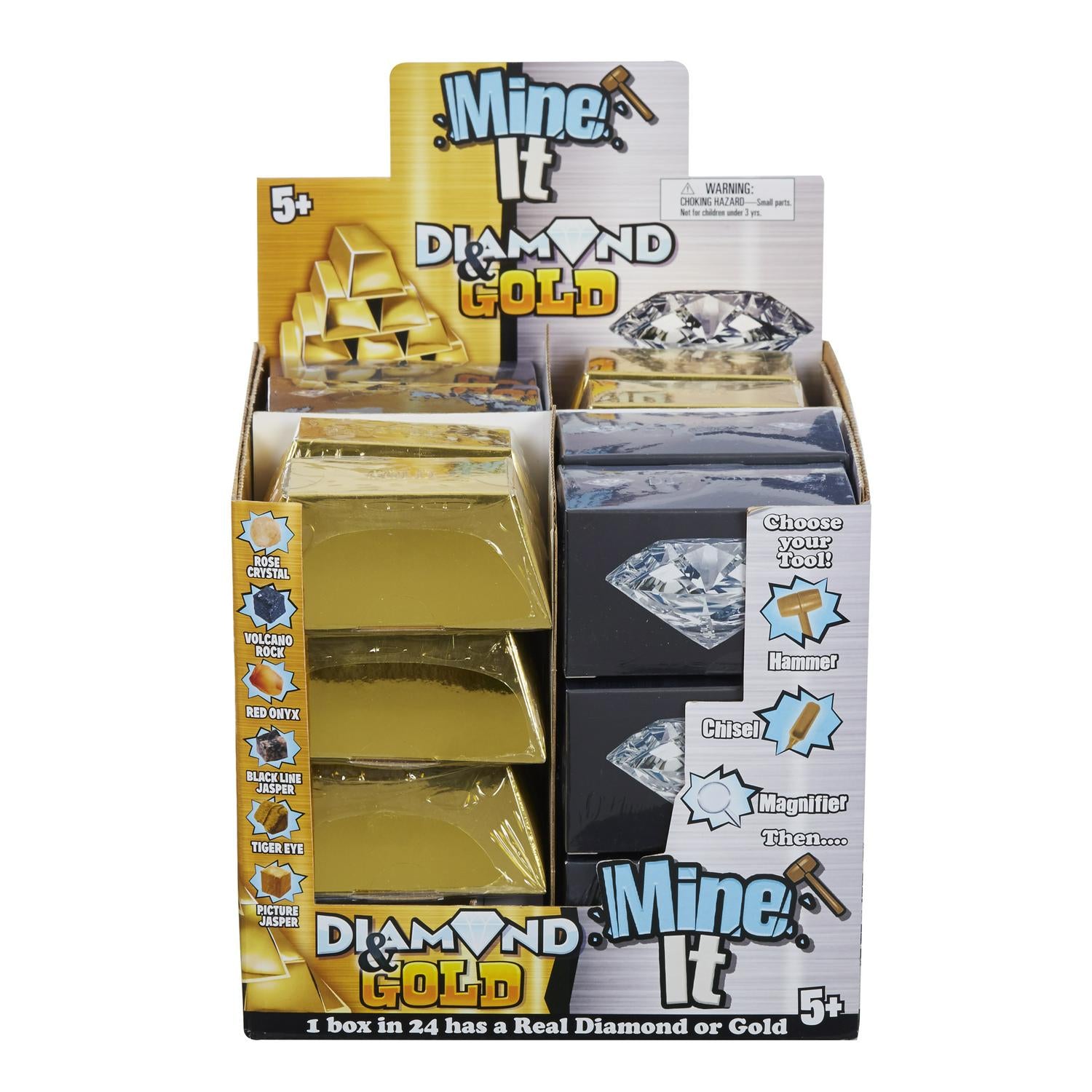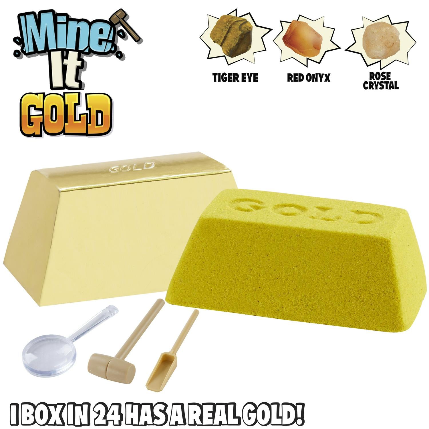 Read MoreBecome a real treasure hunter! Chip away with your hammer and chisel to reveal precious stones every time! There are 6 precious stones to collect; Black Line Jasper, Rose Crystal, Picture Jasper, Red Onyx, Tiger Eye and Volcanic Rock. But will you be lucky enough to find real diamond and gold? The hunt is on! Discover and collect them all with Mine it! Each pack includes either a 1 x Diamond or Gold Bar, 1 x Chisel, 1 x Magnifying glass and 1 x Hammer.