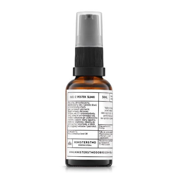 Ministerstwo Plum Seed Oil, presented in a 30ml bottle, is rich in essential fatty acids and Vitamin E. This quick-absorbing oil carries a distinctive marzipan aroma during application. It offers comprehensive benefits for the skin, hair, and nails, functioning as a versatile conditioning treatment.