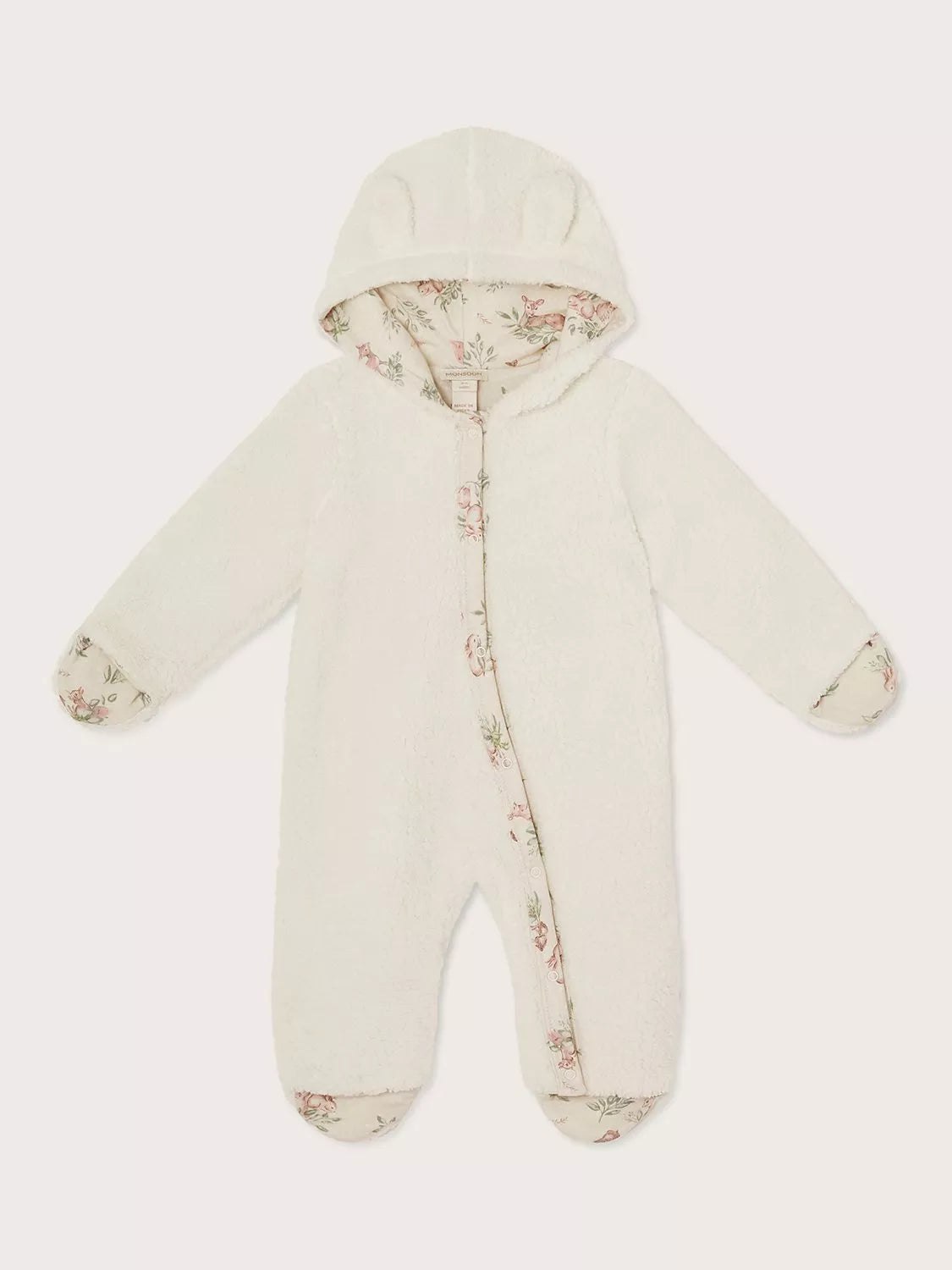 A zip and popper front opening is a quick and easy way to make baby snug and cosy. This warm and soft teddy fabric pram-suit is ideal for chilly days out. Finished with an adorable printed lining.