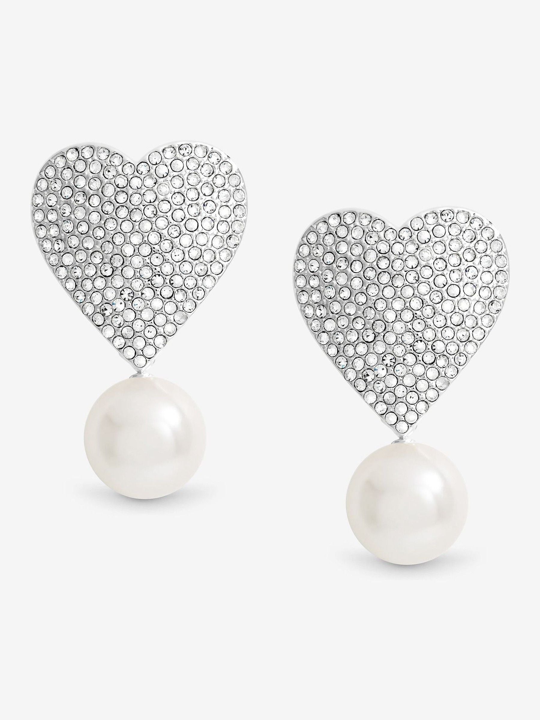 Mood Silver Crystal Heart with Pearl Drop Statement Earrings are the perfect bold design. With shimmering crystal stones and pearl these earrings are made to make a statement, they’re perfect for elevating any look. Wear them solo or mix and match with our other MOOD styles for a touch of everyday glam.