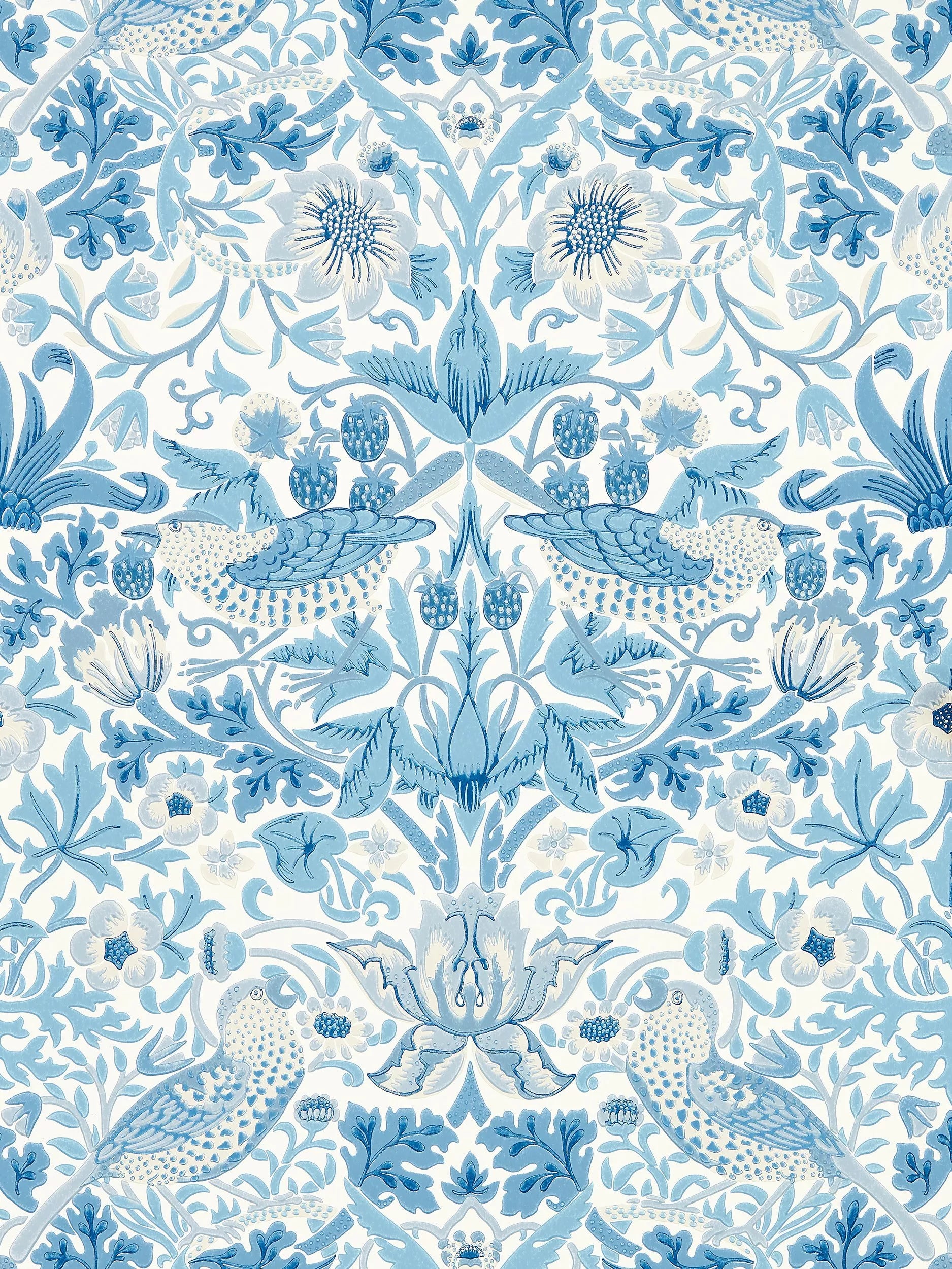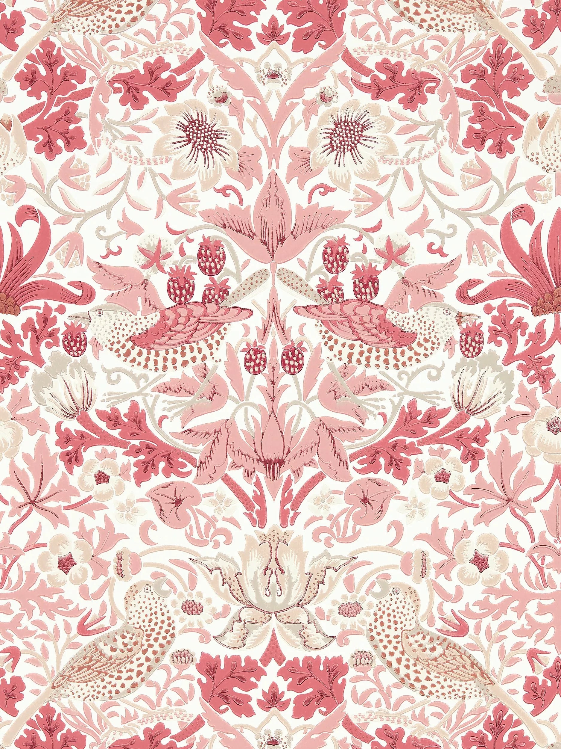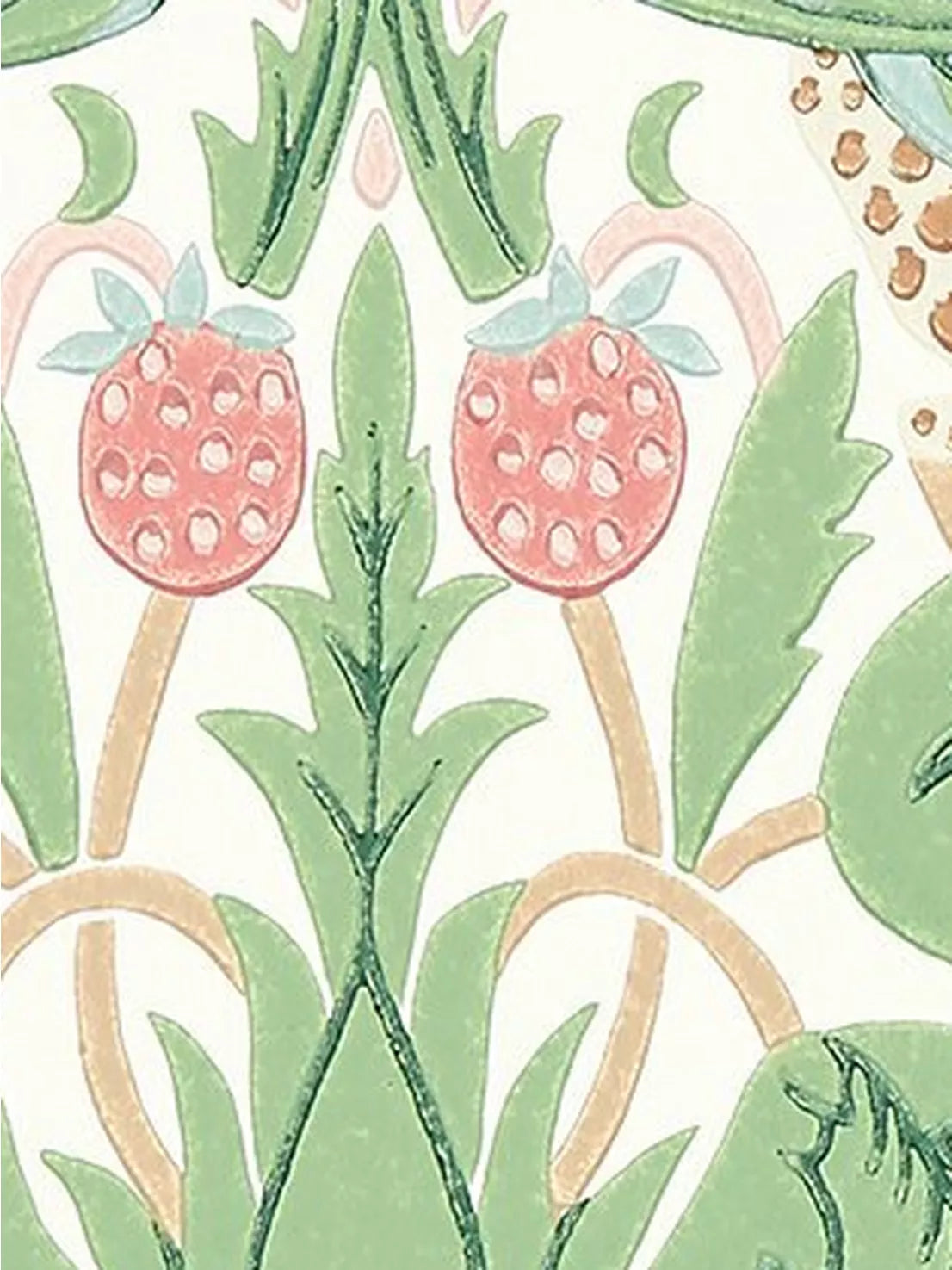 A cheeky bird pecks at delicious strawberries on this iconic Morris & Co. design, repainted and engraved here for the first time to enable surface printing. This new interpretation of "Strawberry Thief" displays an authentic hand-block printed look.