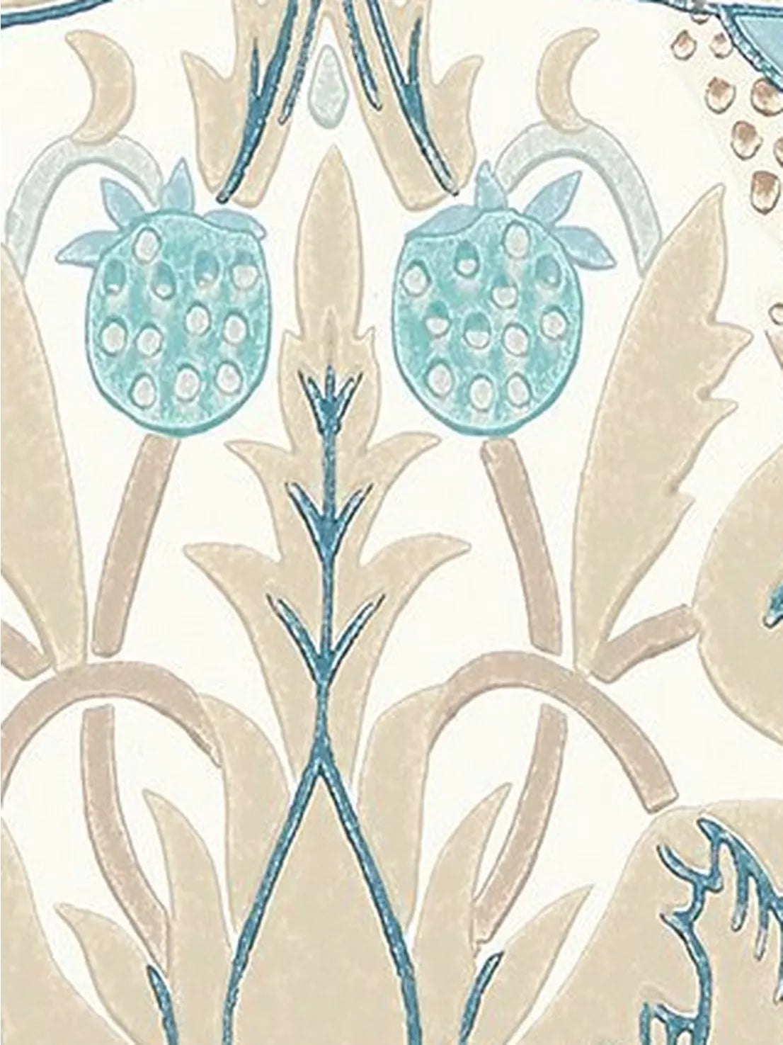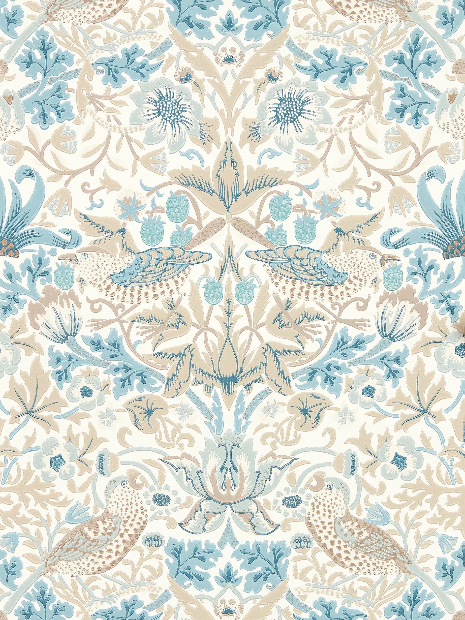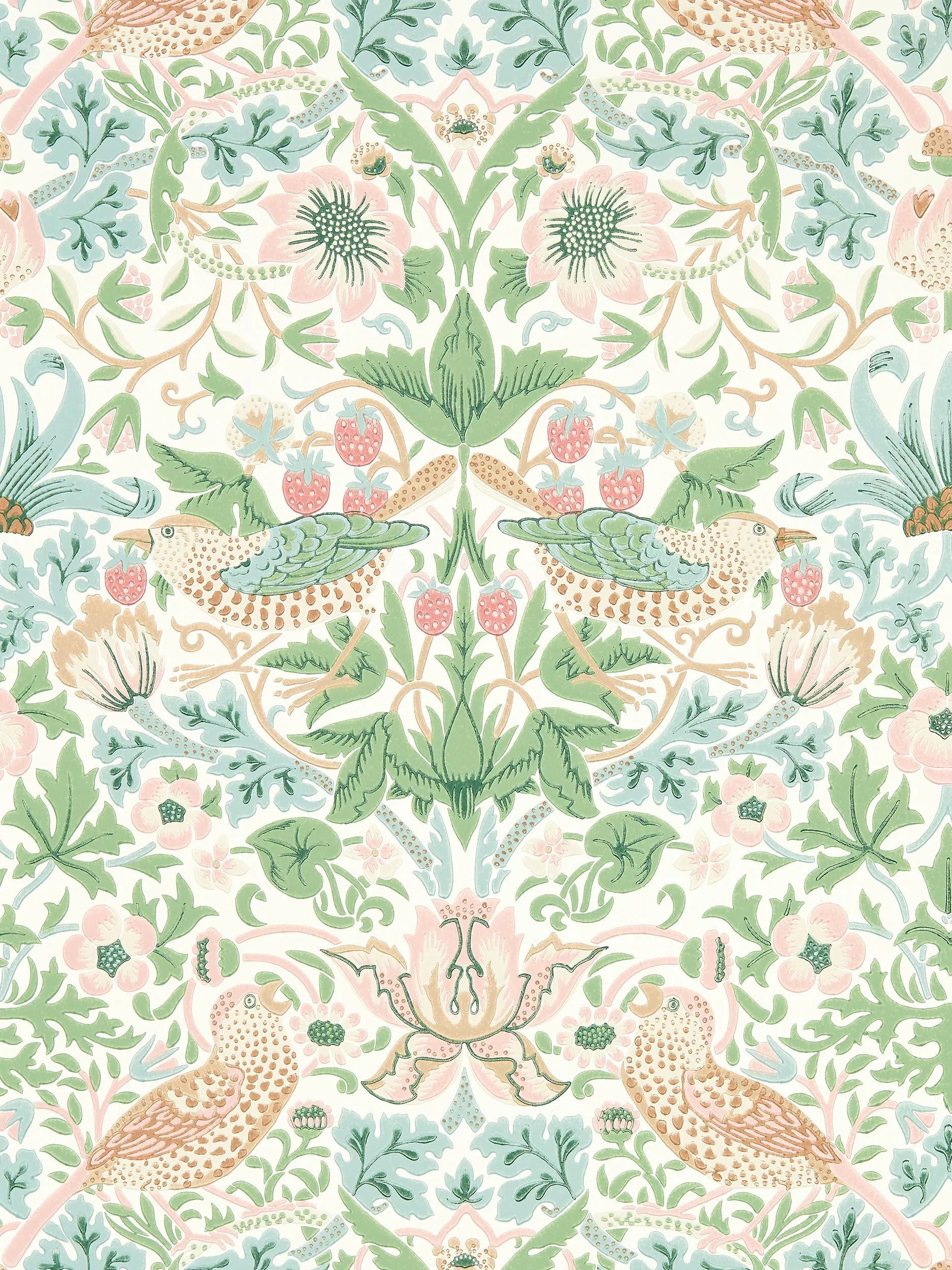 A cheeky bird pecks at delicious strawberries on this iconic Morris & Co. design, repainted and engraved here for the first time to enable surface printing. This new interpretation of "Strawberry Thief" displays an authentic hand-block printed look.