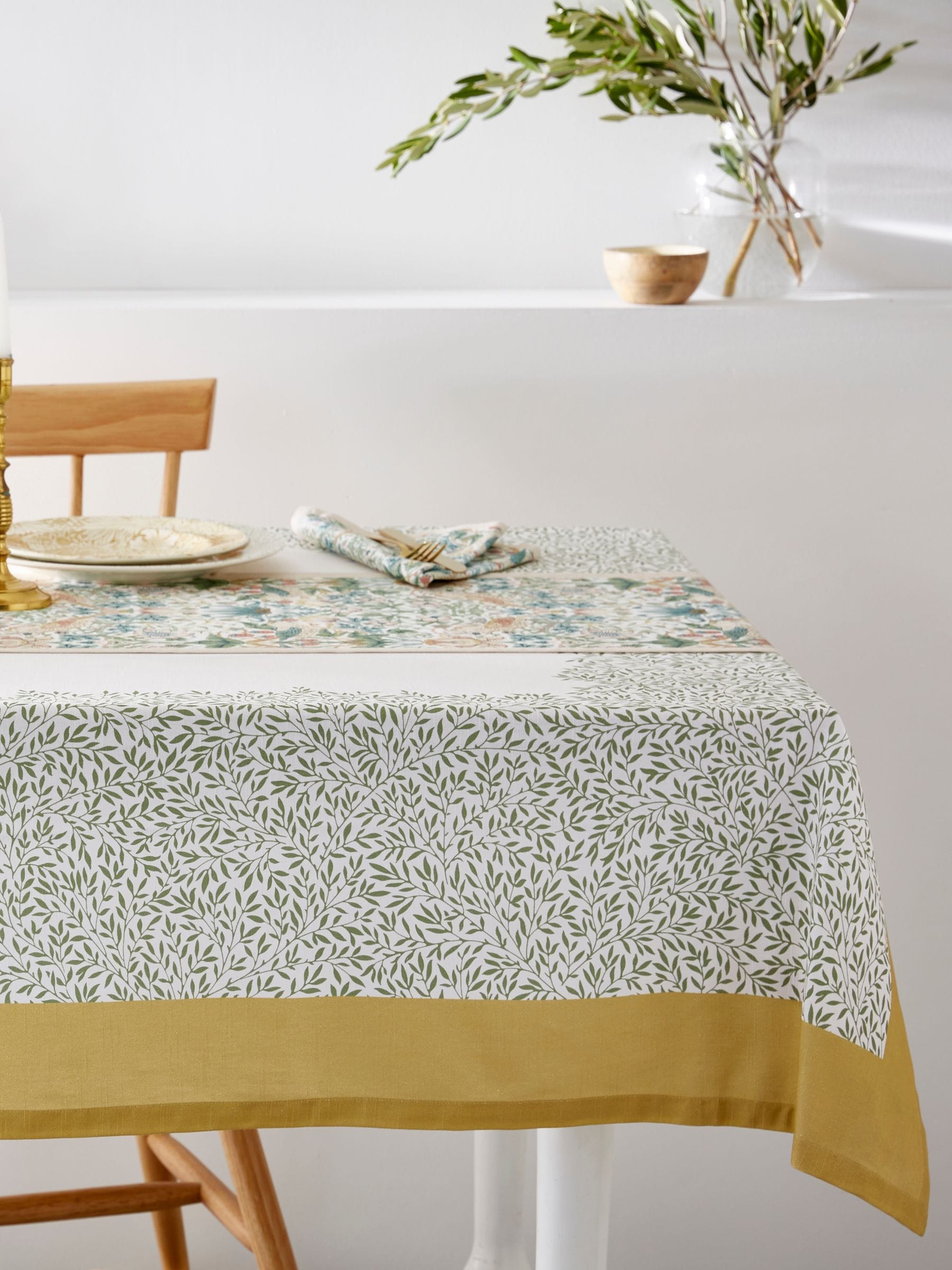 This beautiful cotton tablecloth from Spode’s Morris & Co. collection features the pretty Standen design, a delicate all-over leaf pattern, in a gentle green colourway. Finished with a bold yellow border for a fabulous statement. Made from 100% cotton, use it to adorn your table and pair it with the matching textiles from the rest of the collection.