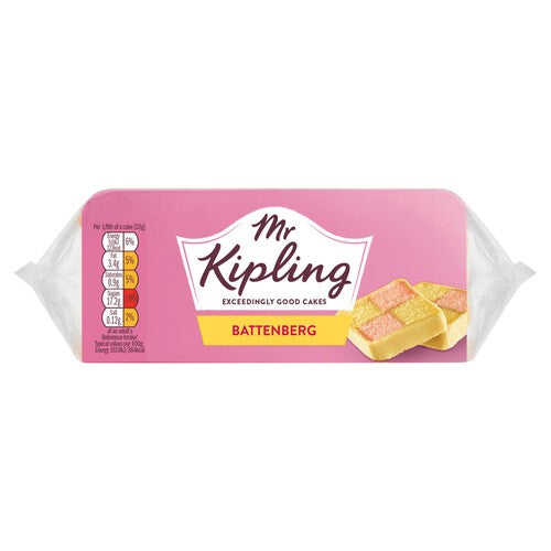 Enjoy a moment of indulgence with this traditional Mr Kipling Battenberg Cake, ideal for pairing with a cup of tea. This classic loaf features four distinct squares of pink and yellow sponge arranged in a characteristic checkerboard pattern.