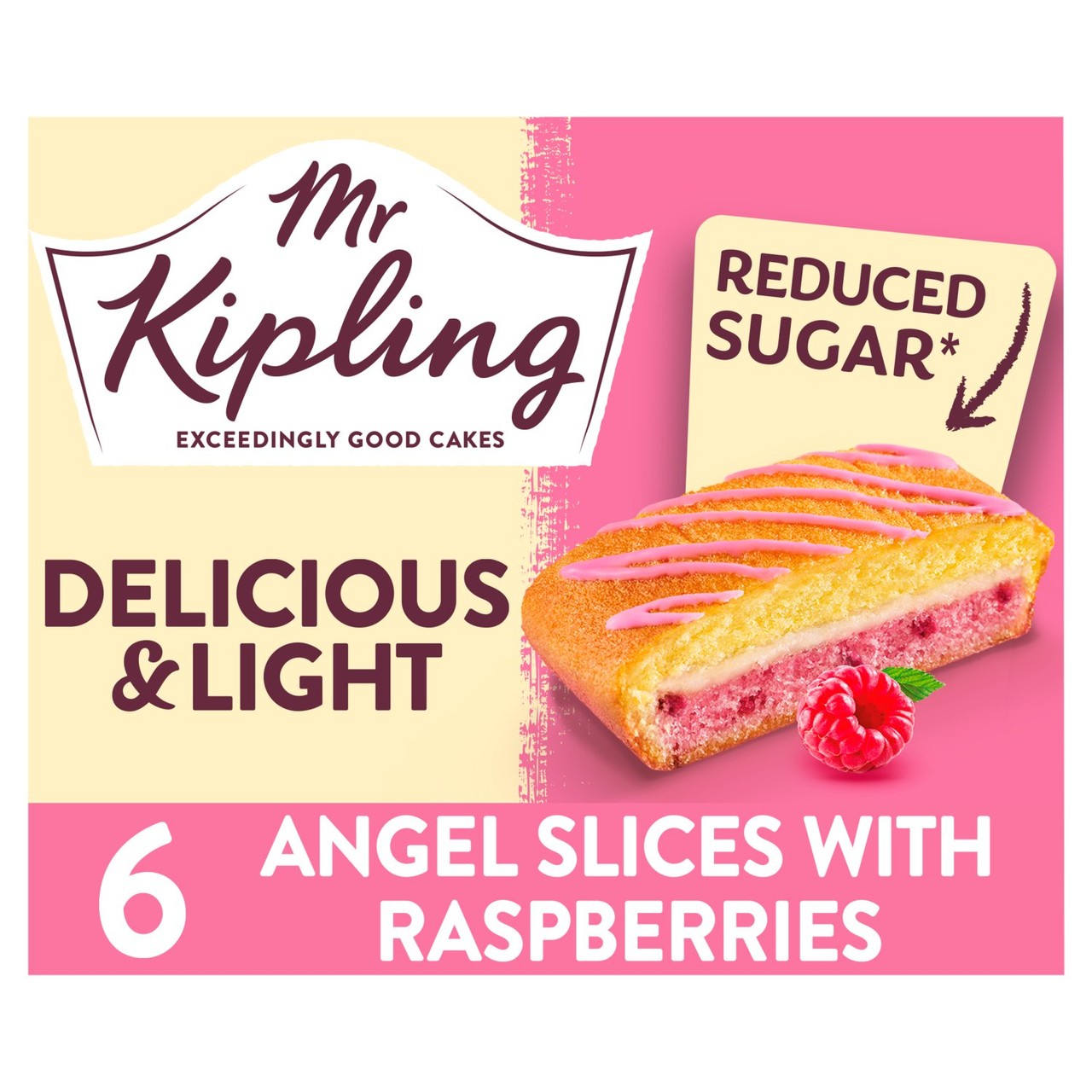 Treat yourself to Mr Kipling Angel Cake Slices layered with yellow and pink raspberry sponge cake. These delightful slices are filled with a fruity raspberry flavour filling and topped with luscious pink icing for a satisfying finish. They are perfect for enjoying as a lighter indulgence when you need a sweet moment.