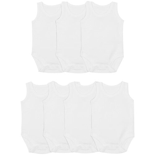 These white, sleeveless cotton bodysuits are perfect for layering under clothes to keep little ones cosy and warm. This value pack contains seven bodysuits crafted from soft organic cotton for daily use. The construction incorporates thoughtful features aimed at maximum comfort for your baby.