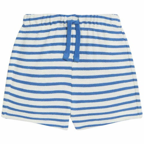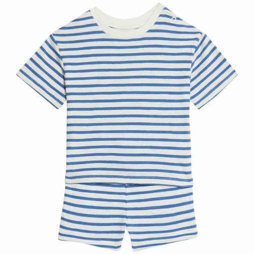 This pure cotton outfit is designed for comfort during warmer weather and sunny days. Featuring a cheerful blue stripe pattern, this practical set is ideal for easy everyday wear. It provides a complete look comprising both a short-sleeved top and matching shorts for simplicity and style.