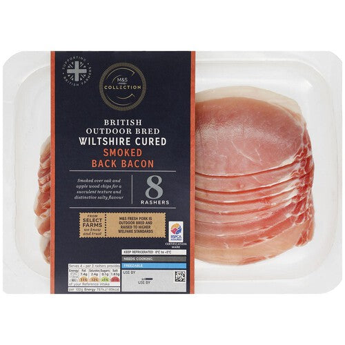 This M&S Collection smoked back bacon features rashers from outdoor-bred British pigs, cured in Wiltshire for quality assurance. The bacon is distinctly flavoured by being smoked over traditional oak and applewood chips, yielding a rich, salty taste and succulent texture. It provides a premium centrepiece for any breakfast plate or meal preparation.