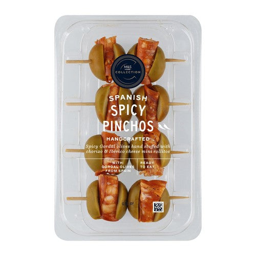 This M&S Collection item presents a selection of Spanish tapas crafted for exceptional quality. Tender and plump Gordal olives form the base for these savoury appetisers. They are generously filled with rich Ibérico cheese, traditionally made using sheep's, goat's, and cow's milk for complexity. Each prepared olive is then wrapped securely in a slice of spicy chorizo, creating an intense flavour profile.