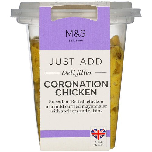This M&S Deli Filler captures the classic taste of Coronation Chicken. It features succulent pieces of British chicken blended precisely into a mild, curried mayonnaise base. This preparation offers a rich texture and balanced flavour profile suitable for immediate use.