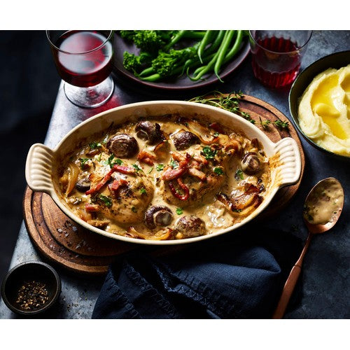 This Gastropub ready meal combines buttermilk marinated British chicken with forest ingredients, offering an elevated taste experience. It features bacon and tender vegetables in a rich, creamy white wine sauce, providing a satisfying dinner option for two.