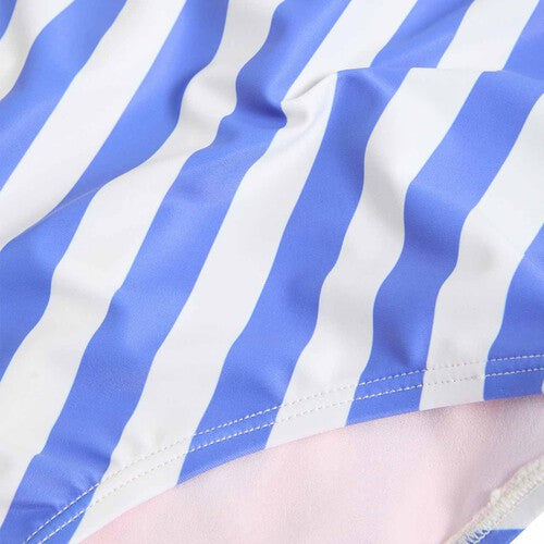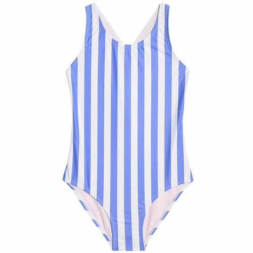 This regular fit swimsuit features a fun blue striped design, making it perfect for your child's poolside adventures and beach trips. It is constructed with added stretch material to ensure comfort and flexibility during wear. This stylish piece is designed for practical use throughout the swimming season.