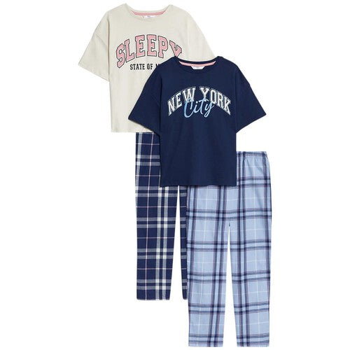 They'll always have a pair handy with this two-pack of pure cotton pyjamas. Comfy regular fit. Casual short-sleeved tops feature varsity-style slogans on the chest. Full-length bottoms are complete with an all-over check print.