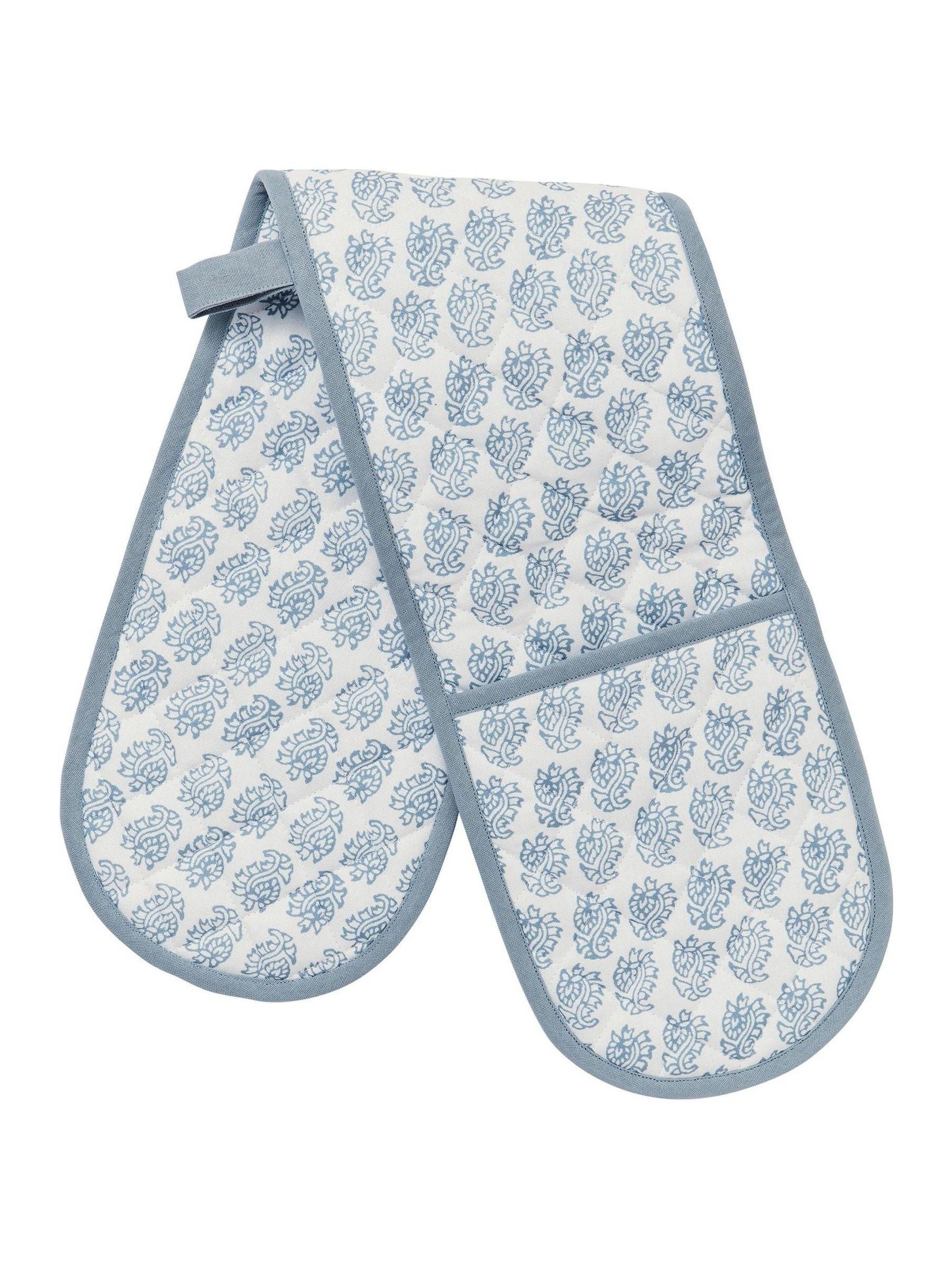 A quilted double oven glove with all-over block print pattern in Ballintoy Blue, complete with hanging loop. 100% Cotton.