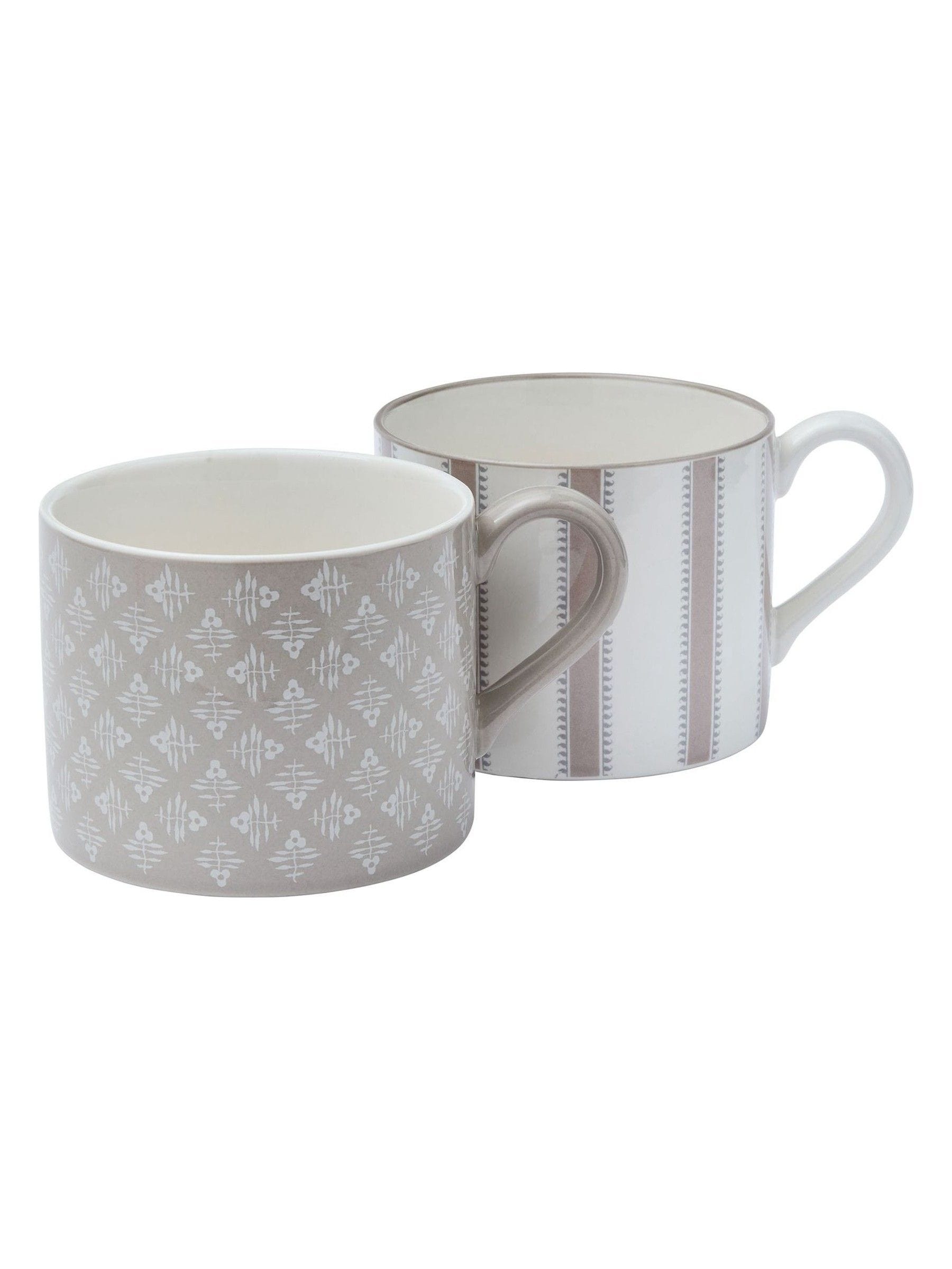 Sip in style with this charming pair of stoneware mugs, featuring two timeless designs in a Linen colourway. One showcases a geo sprig pattern, while the other boasts a contemporary striped design. Perfect for morning coffee, afternoon tea, or a thoughtful gift.