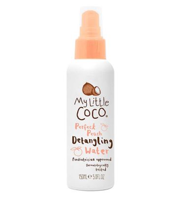 This My Little Coco detangling water is enriched with nourishing organic coconut oil and carries a soft, sweet peach fragrance. This 150ml solution is specifically formulated to assist with daily hair management for easier brushing. The packaging highlights that the product has undergone rigorous paediatrician approval and dermatological testing procedures.