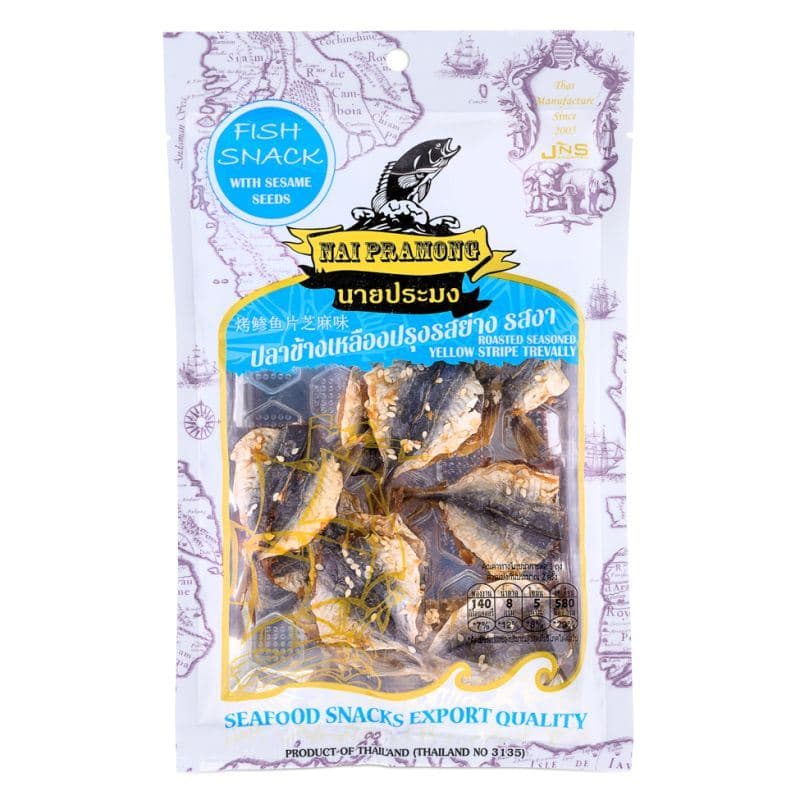 Discover a uniquely delicious snack with Nai Pramong Roasted Seasoned Yellow Stripe Trevally with Sesame Seed – a flavourful fusion of savoury fish and nutty sesame. This convenient snack is perfect for those seeking a satisfying and aromatic treat.