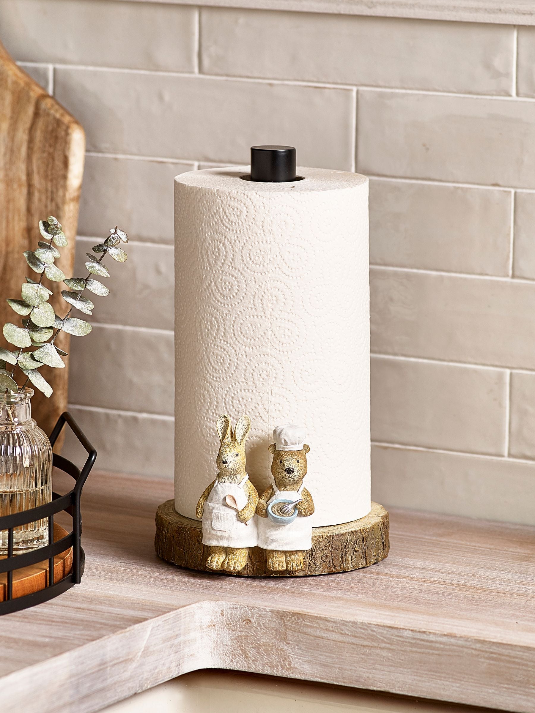 Add some character to your kitchen with this adorable kitchen roll holder. In a rustic 'Woodland Kitchen' finish, the base on this kitchen roll holder features Bertie Bear and Rosie Bunny dressed in adorable chef outfits ready to whisk up a delight.