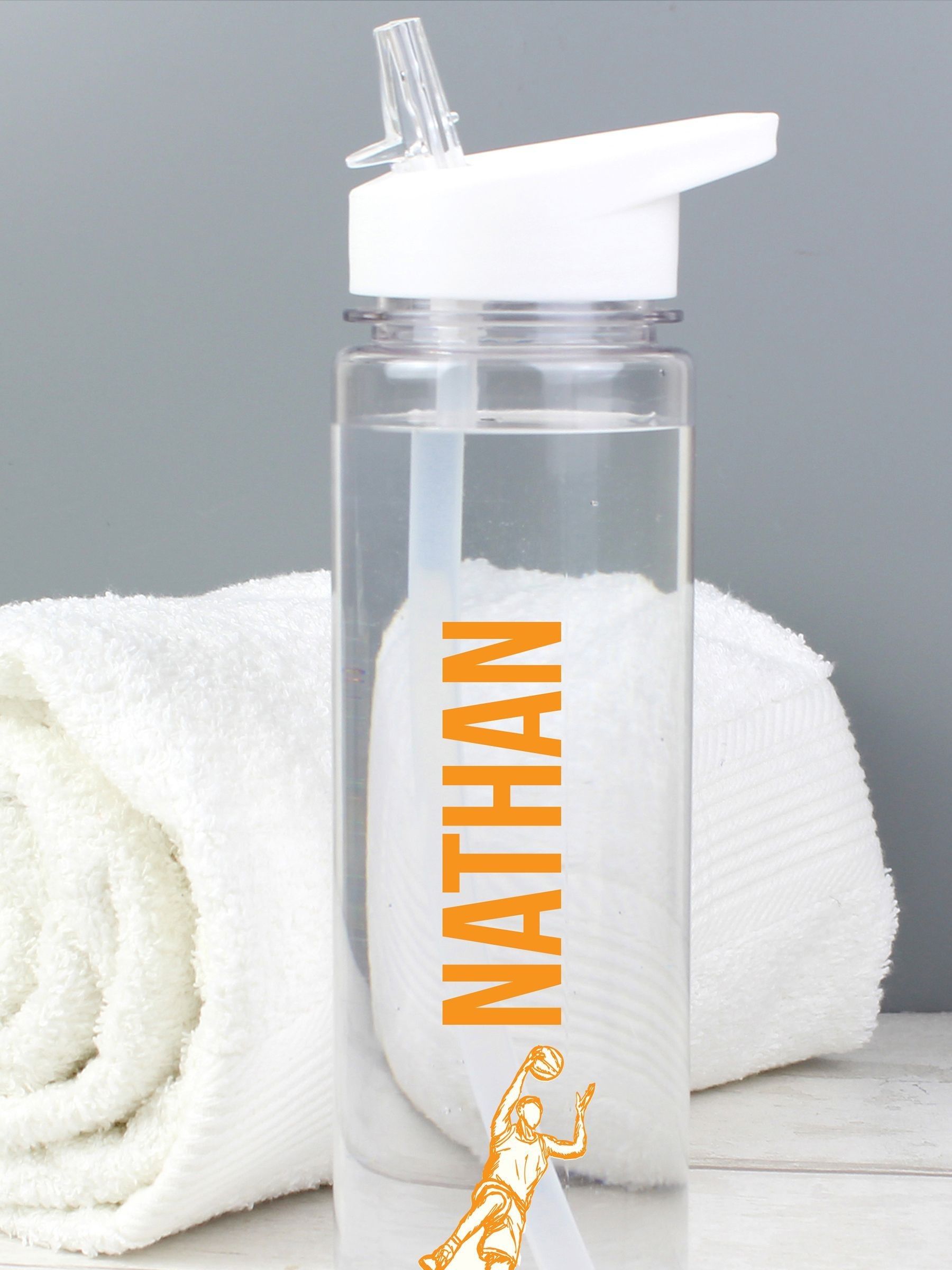 Keep hydrated with our BPA Free, 800ml transparent water bottle. Select you sports person and add your name using 12 characters. The water bottle features a white screw top lid with a foldable spout for drinking.