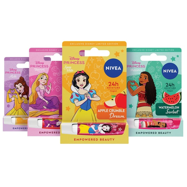 Product InformationNIVEA Disney Princess Lip Balm keeps your lips moisturised and hydrated with natural ingredients for 24 hours.Included in this bundle:This bundle includes 4x NIVEA Disney Princess Lip Balms.Features- This bundle includes 4x NIVEA Disney Princess Lip Balms. NIVEA Disney Princess Rapunzel Limited Edition Wild Cranberry Lip Balm 4.8g. NIVEA�S... Read More