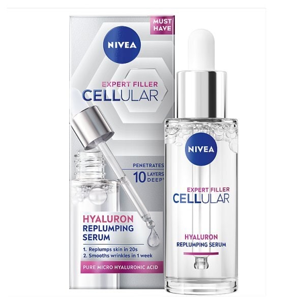 nivea cellular filler hyaluronic acid serum discover cellular level antiageing skincare with over 100 years of experience we at nivea understand the fundamentals of skin care we know that with age skin cell renewal slows down and it takes longer for new younger skin cells to develop this leads to skin appearing duller and older this is why we have developed the nivea cellular filler range to provide expert antiage care for your skin our ultralight hyaluronic acid serum quickly absorbs into the skin the formula helps to activate and accelerate the cell regeneration process it has an ultralight texture that can be quickly absorbed by the skin and contains 20 hydra elixir and micro hyaluronic acid to deeply hydrate and refresh the skin your skin is instantly replenished supple and optimally prepared for your care application the effective hyaluronic acid serum visibly smoothens skin surface gives skin suppleness replenishes skins own moisture provides instant deep care smooths wrinkles in 1 week