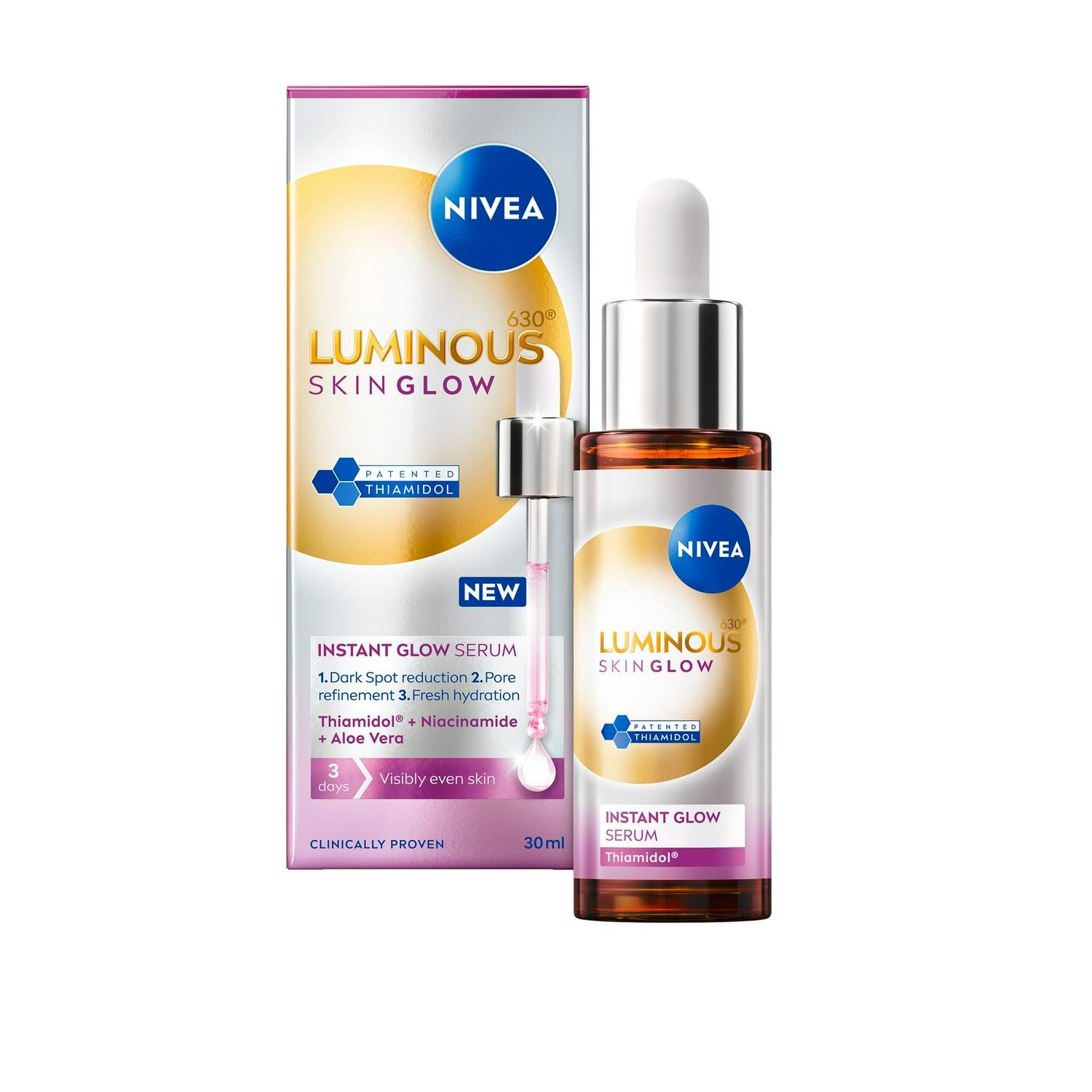 LUMINOUS630® SKIN GLOW Instant Serum 30ml is NIVEA's first to unlock multiple powers of glow: 1. EVENNESS: evens skin in 3 days & clinically proven dark spot reduction in 14 days. 2.PORE REFINEMENT: refines pores & smoothes skin within 3 days. 3.FRESH HYDRATION: Provides fresh hydration instantly and long term. Deeply hydrates the skin. 2x more glowy skin after 2 weeks (self assessment, 42 women).