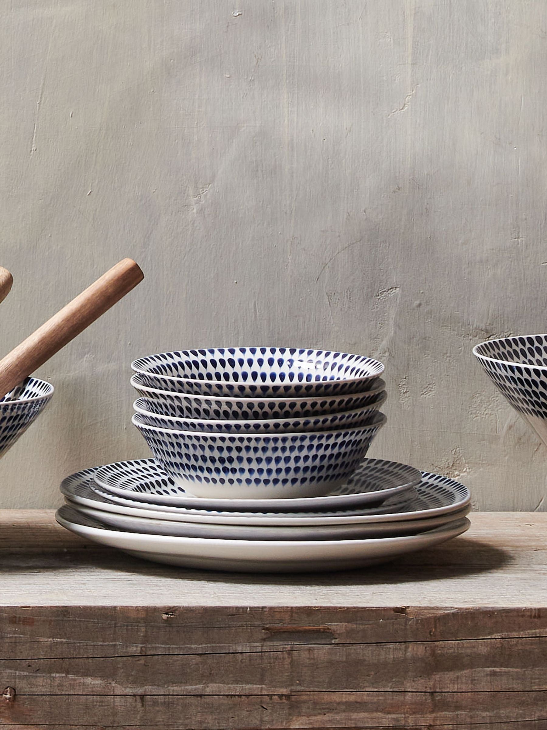 This 12-piece set includes four dinner plates, four side plates, and four bowls—each one individually hand-painted with our distinctive Indigo Drop pattern.