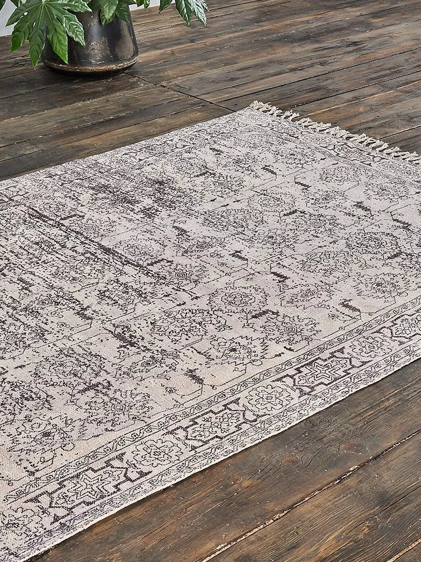 Understated and sophisticated, the aged-look of this stunning Iria rug has an antique looking print. The off-black tones lay softly over a natural colour base. Handwoven on traditional handlooms in India by talented artisans.