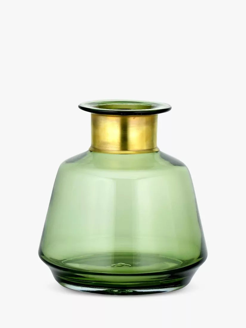 The beautiful Miza vase by Nkuku is perfect for showcasing your blooms, or simply styled on its own on a sideboard. Made from recycled glass with a decorative brass ring at the neck it has been handcrafted by skilled artisans using traditional tools and techniques.