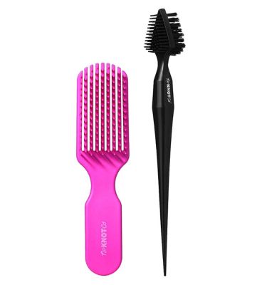 This set from The Knotty Co. includes a pink detangling brush and a black teasing comb for versatile hair management. The tools are designed to address tangles, volume building, and precise styling needs effectively.