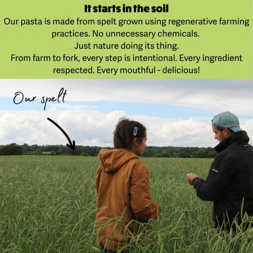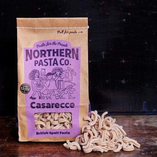 This award-winning Casarecce offers an ultimate al dente bite due to its distinctive curves and grooves. It is intentionally shaped to effectively capture pestoes and rich, creamy sauces. Northern Pasta crafts this speciality product using regeneratively grown British spelt.