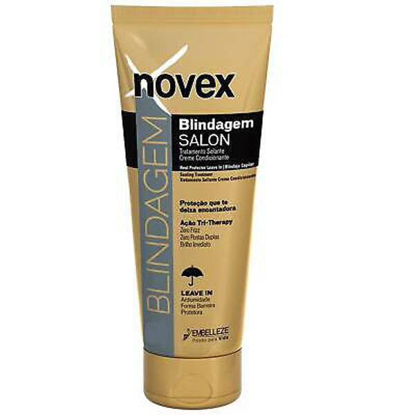 The Novex Blindagem Salon treatment functions as a thermal protector that reinforces hair structure. It seals the cuticles by forming a crucial protective film over the strands during styling. This leave-in product provides essential care and protection for hair requiring intensive recovery.