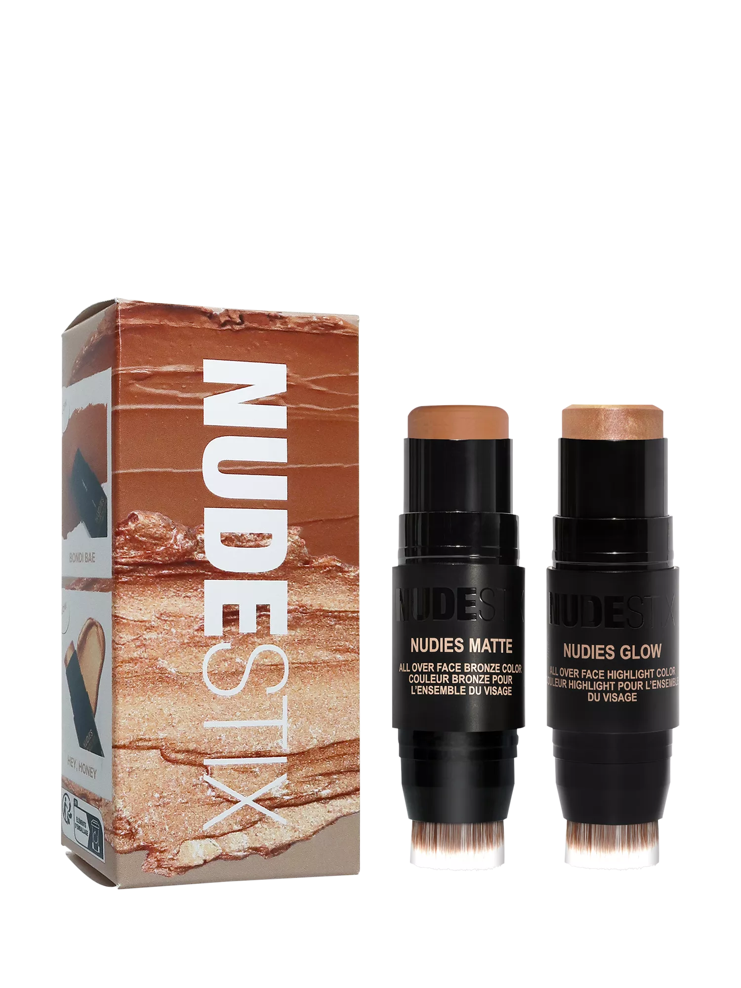 Introducing the Nudies Bronze & Glow Duo – a kit featuring two Nudies All Over Face Colour in both matte and glow, to give you a perfect natural contour and sun-kissed radiance. These stix are dual-ended with soft colour on one side and a blending brush on the other for application convenience. Made to kiss your skin with an effortlessly fresh, natural, and youthful ‘no-makeup makeup’ look.