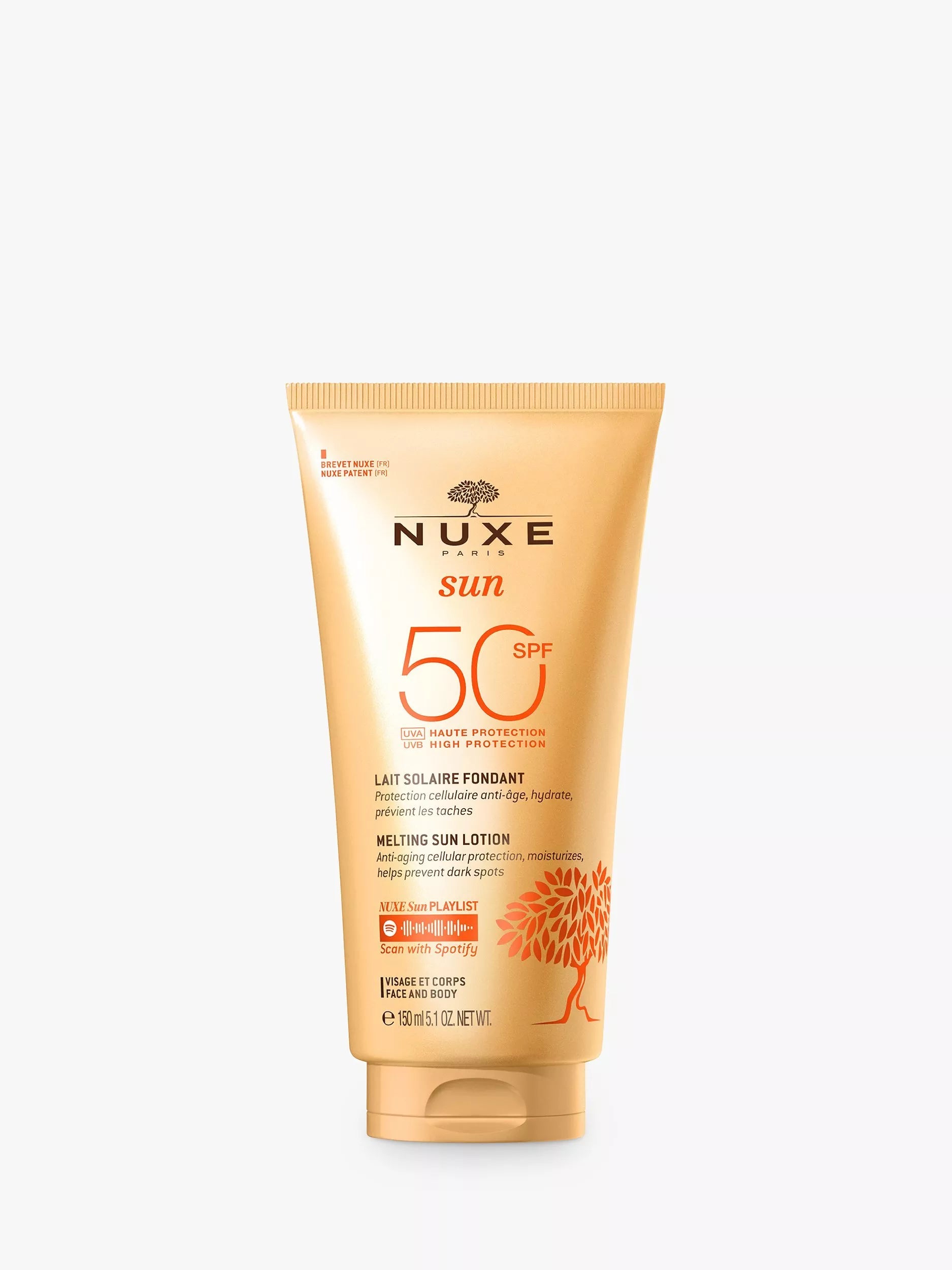 Indulge in luxurious sun protection with NUXE Sun High Protection Melting Lotion. This SPF 50 cream melts into your skin, providing superior protection against harmful UV rays while moisturizing and preventing premature aging. Experience a delightful summer scent and achieve a radiant, healthy tan.