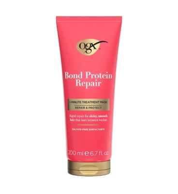 Read MoreRapidly revitalize and nourish your hair in just a minute with OGX Bond Protein Repair 1-Minute Treatment. This nourishing hair mask protects and smooths dry, damaged hair while adding shine that lasts between washes. The protein-infused hair mask treatment helps prevent breakage and helps you achieve your healthiest and most resilient hair. After shampooing and conditioning with your favorite OGX products, apply a generous amount of the hair treatment mask onto your palm and evenly distribute it into your hair from the mid length to the ends, then rinse thoroughly after a minute. Combine the OGX Bond Protein Repair 1-Minute Treatment with the entire OGX Bond Protein Repair line to cleanse, condition, treat, protect and style.