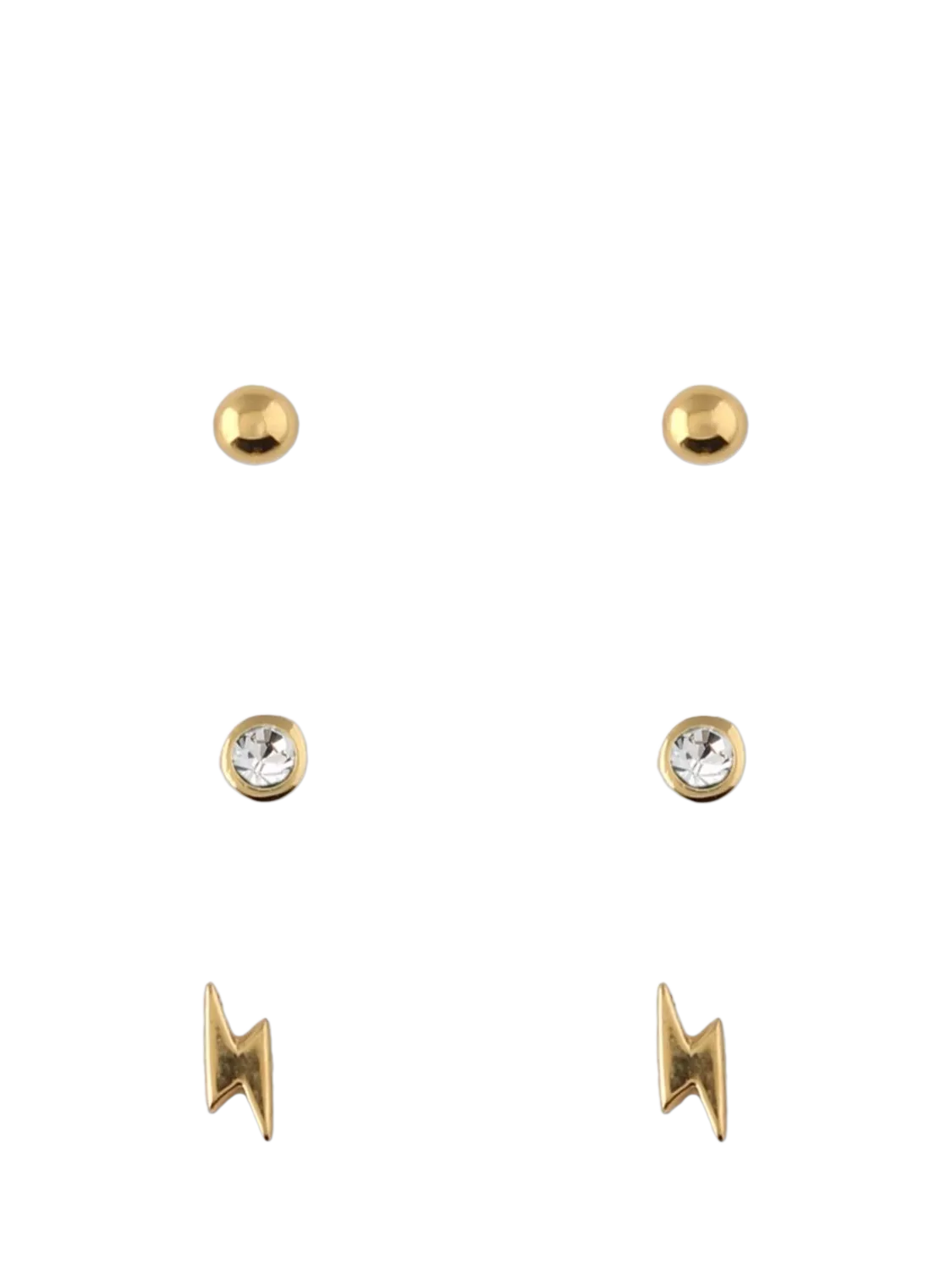 A set of three pairs of earrings from Orelia. Featuring a pair of classic ball studs, a pair of Swarovski crystal studs and two dainty lightning studs. Creating the perfect ear stack.
