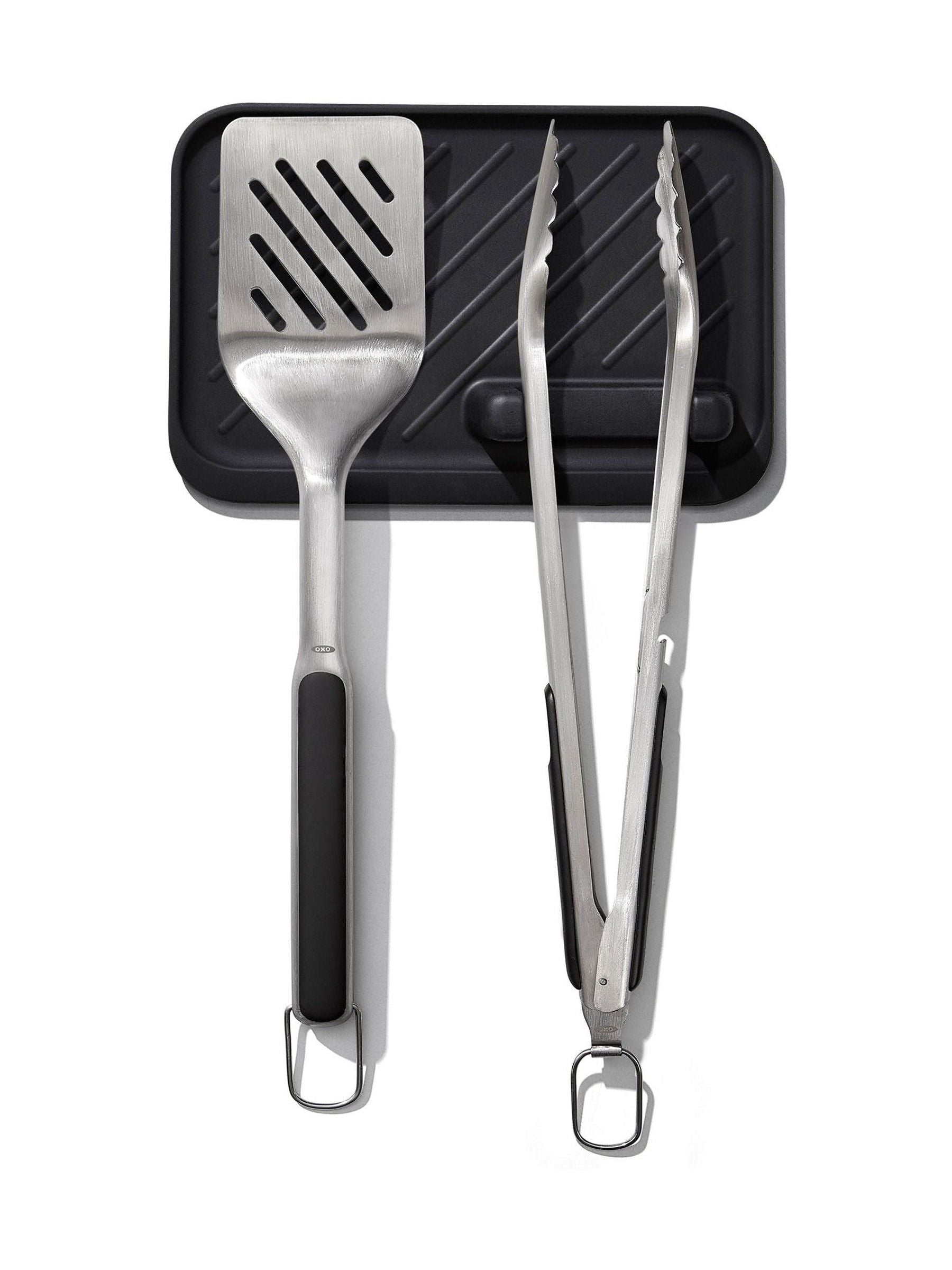 The OXO Good Grips 3-Piece Grilling Tool Set is a must-have for beginner and seasoned grillers alike. The set includes Grilling Tongs (with scalloped edges for fumble-free grabbing and a built-in bottle opener for grill-side sipping). A Grilling Turner (with a double-bend design for leverage while flipping). Finally, the Grilling Tool rest provides a neat, heat-resistant surface to rest your tools while you grill. The non-stick silicone construction and unique tong holder help with one-handed use–no more locking and unlocking tongs between turns. The tongs and turner have extra-long handles and non-slip grips for comfort and control. Dishwasher safe.