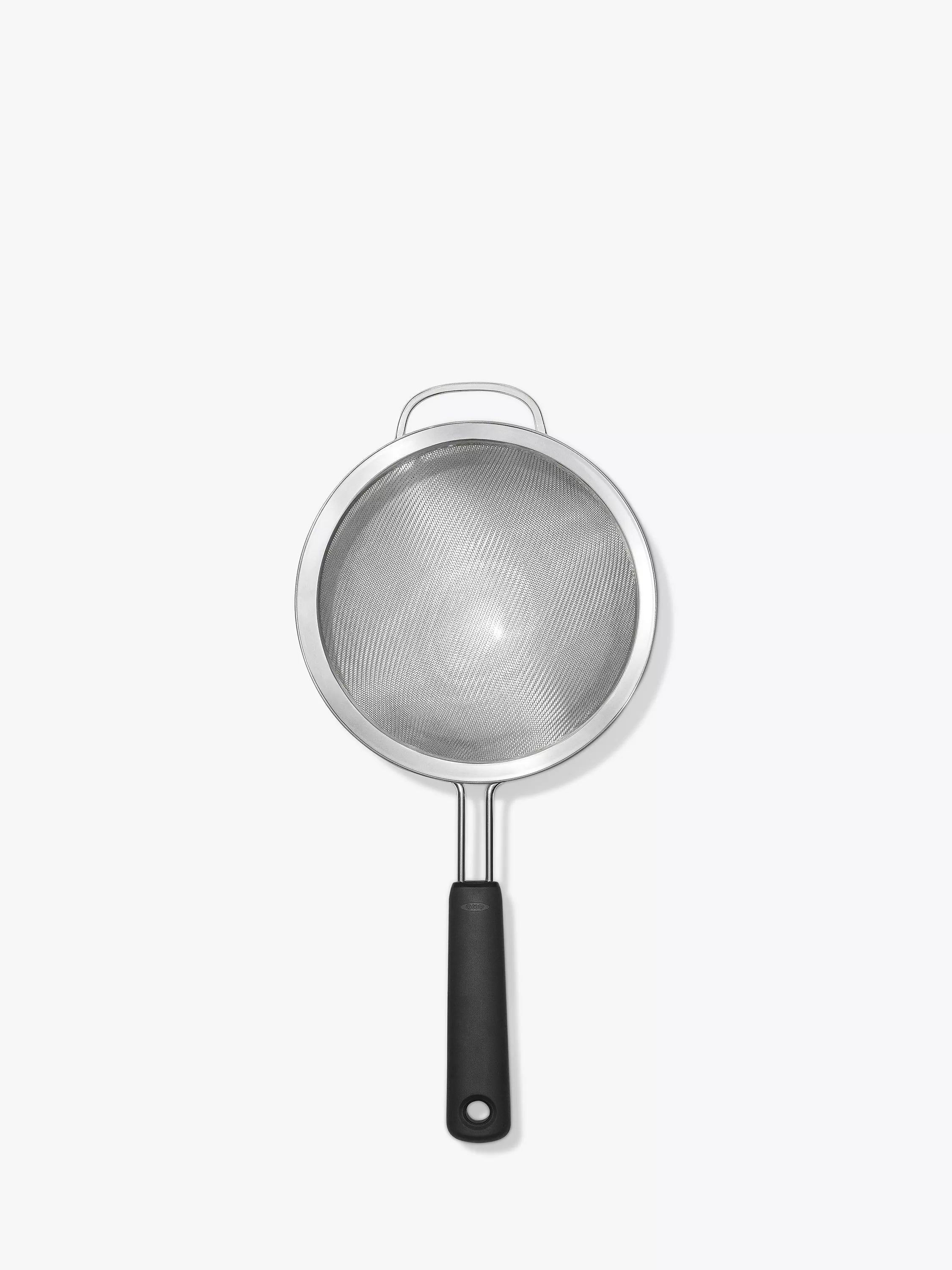 The OXO Good Grips Fine Mesh Strainer is great for draining excess liquid from just about any food, including fruit, vegetables, grains, beans, rice, pasta and stock. A wide stainless steel rim and balancing loop help secure the strainer on almost any bowl or pot, and the double-rod handle stands the test of time.