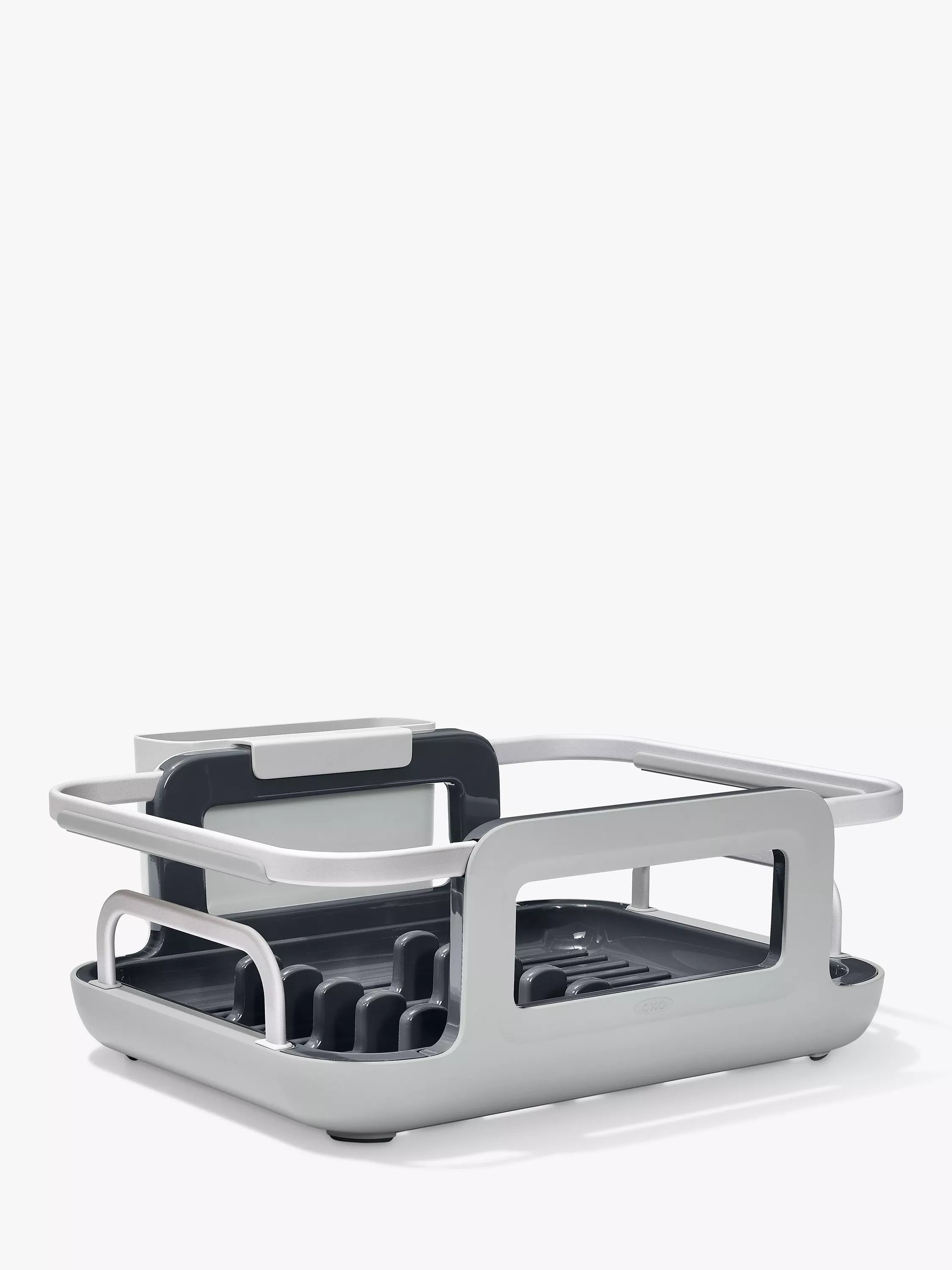 Extend the rack’s arms to fit over different sink sizes and drain your dishes directly into the sink to save space and stay tidy. The arms can also be retracted to use the rack inside the sink or on a drying mat on the worktop. The unique plate holders keep dishes and bowls upright, and the divided utensil cup is removable for convenient unloading.