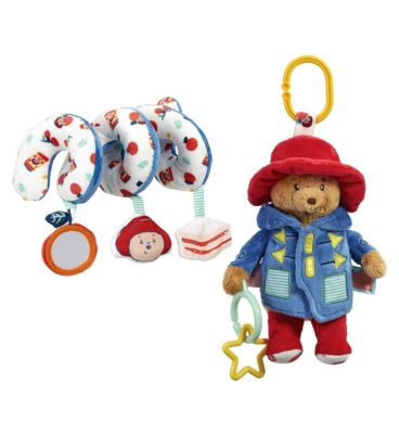 Babies will be captivated by this soft fabric Paddington activity spiral, featuring familiar colours, movement, and sounds. It easily attaches to prams, cots, or car seats for engagement during travel or rest. This toy encourages early sensory exploration suitable from birth.
